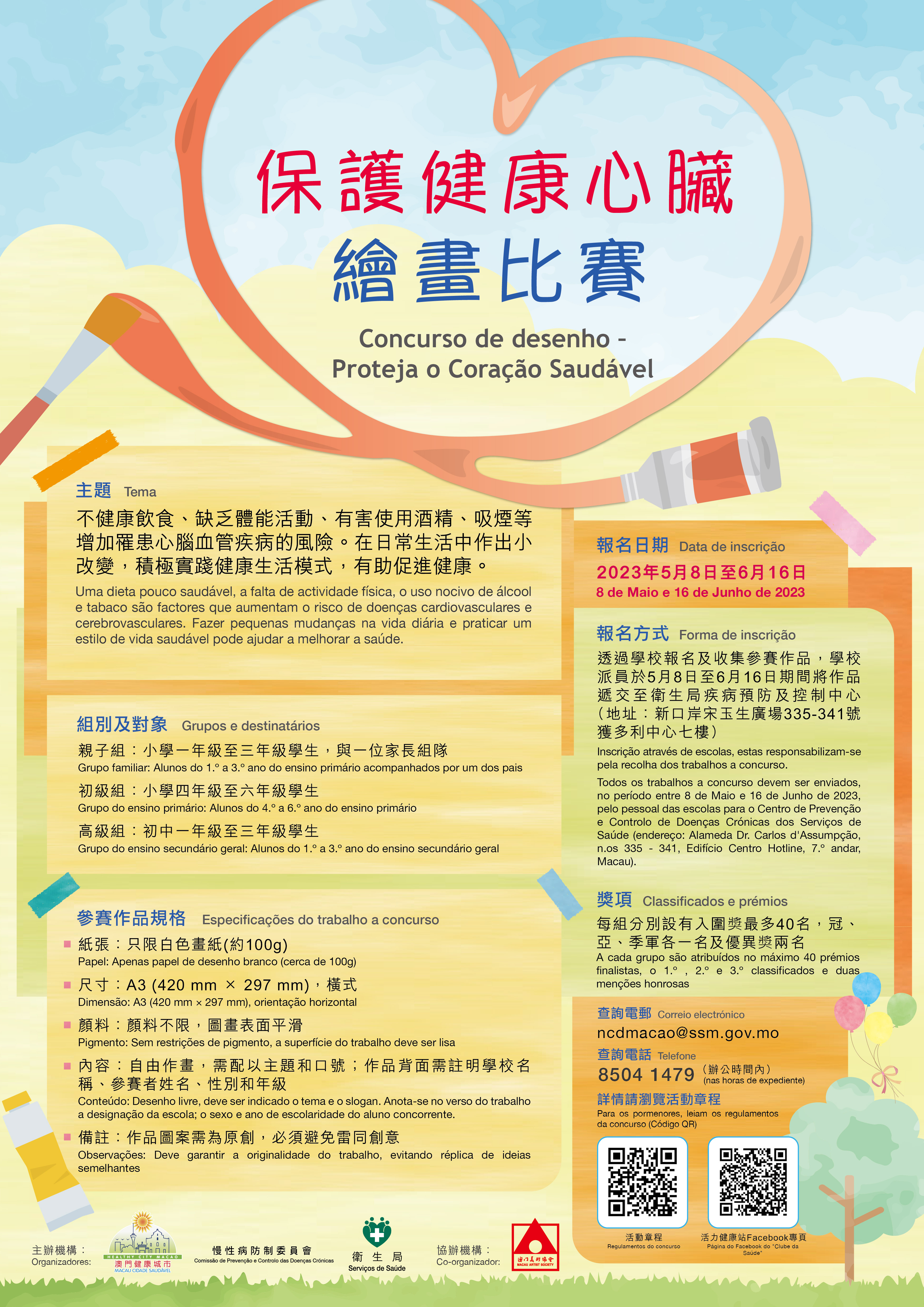 衛生局為配合“世界高血壓日”,持續推動社會關注心腦血管疾病,5月至12月期間聯同健康城市委員會及慢性病防制委員會合辦、澳門美術協會協辦“保護健康心臟”繪畫比賽系列活動,期望提升本澳學童對心腦血管疾病的關注,在繪畫創作過程中了解心腦血管疾病的病因、預防方法及健康生活對預防疾病的重要性,從而激勵從小養成良好的健康生活習慣,積極建構健康的財富,遠離心腦血管疾病。是次繪畫活動分為親子組(小學一年級至三年級學生,與1位家長組隊)、初級組(小學四年級至六年級學生)和高級組(初中一年級至三年級學生),參加者可透過就讀學校報名及遞交參賽作品,6月16日截止收件,比賽結果9月上旬公佈,得獎作品於今年9至12月期間在本澳學校巡展。欲了解活動詳情及更多相關資訊,可瀏覽www.ssm.gov.mo/cpc/。