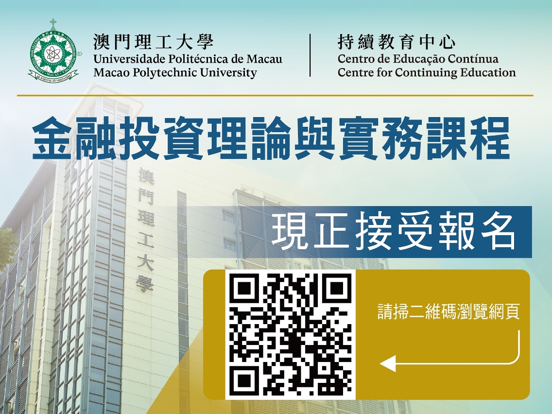 “金融投資理論與實務”課程內容包括股票、基金、債券、衍生工具等金融投資標的基礎知識;證券投資入門所需關注的重要指標和實務;金融投資標的基礎知識和風險成本控制策略等。課程以廣東話授課,可使用教育及青年發展局持續進修發展計劃個人進修帳戶支付。出席率達總課時85%可獲由澳門理工大學持續教育中心發出的證書。