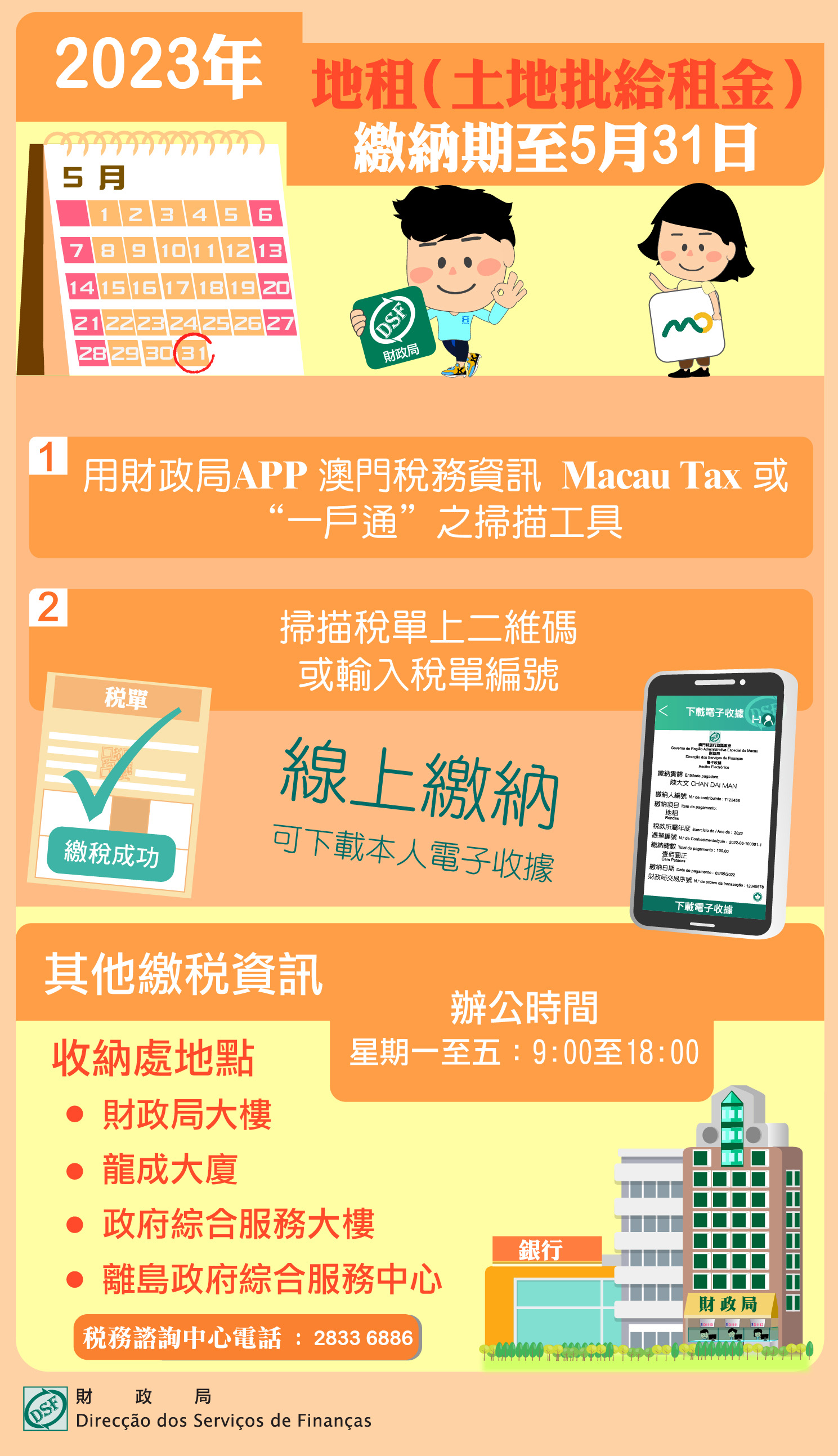 2023年地租(土地批給租金)最後繳納期限至5月31日止,為免增加排隊輪候時間或因逾期繳納而須附加過期利息和罰款,財政局呼籲倘仍未繳納上述地租納稅人儘快繳納。