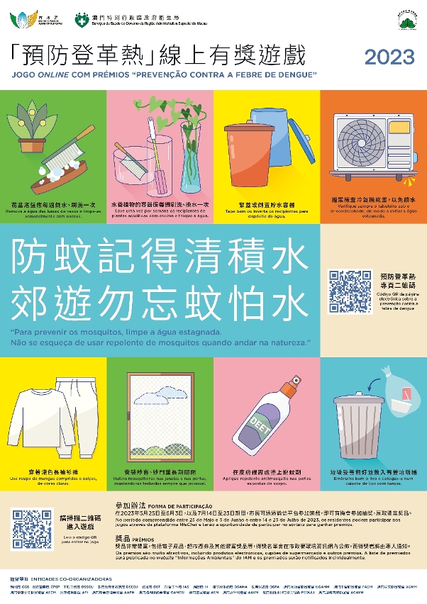 為進一步加強向市民宣傳有關信息,預防登革熱工作小組於本年五月二十五日至六月三日推出第一階段“防蚊記得清積水 郊遊勿忘蚊怕水”線上有獎遊戲。有興趣參加的市民可透過掃描宣傳海報或市政署環境資訊網www.iam.gov.mo/macaohygiene內的二維碼參加遊戲,贏取電子兌換券及參加大抽獎的機會。獲得電子兌換券的市民,可憑券前往市政署望廈山環境資訊中心(澳門望廈炮台斜坡)換領獎品,換領日期至六月十八日下午五時三十分。領奬時須開啟手機程式並出示電子兌換券,再由工作人員輸入兌換編號確認換領。第一階段的抽獎將於六月進行,得獎結果將於環境資訊網內公佈,並有專人通知得獎者。