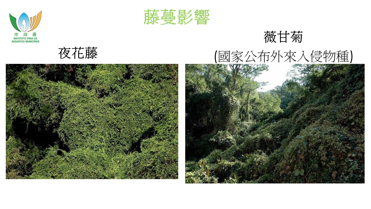健康山林棲地應包含草本、灌木、喬木,具備生物多樣性。近年本澳多處山林看似一片綠油油,實則山體早被瘋長的藤本植物如夜花藤和薇甘菊大面積覆蓋,嚴重危害植物生長,林區逐漸喪失生態功能,無法為生物提供食源及棲息地,影響生物多樣性的可持續發展。此外,上世紀在本澳山林種植的台灣相思、木麻黃等先鋒樹種,雖具改造林區微氣候環境、土壤肥力等作用,但因短壽特性導致多片林區近年出現衰退。故此,有必要清除如夜花藤和薇甘菊一類藤本植物,並透過重植造林,持續修補等手段,復育山林生態,保護山林的生物多樣性。根據《環境狀況報告》數據顯示,2018至2021年,鳥類、哺乳類、昆蟲類等三類生物種類均有上升,兩棲動物類、魚類、爬行類的三類生物種類則持平。