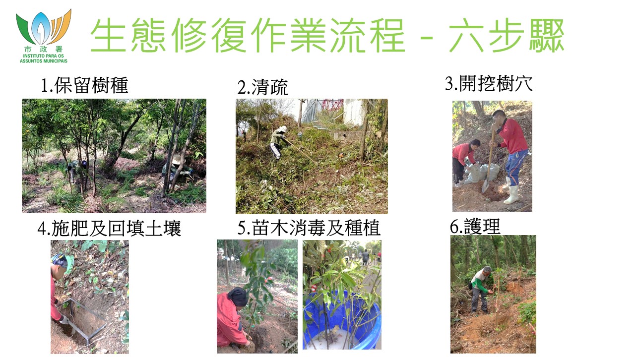 為恢復山林生態環境,市政署在廣東省林業局支持下,聯同廣東省林業科學研究院專家組因應本澳山林特點,訂定修復及優化山林生態的原則、計劃。山林修復承接公司必須依循市政署和專家組製定的修復計劃,按照保留原有樹種、清除藤蔓、開挖樹穴、施肥及回填土壤、苗木消毒及種植、護理六個作業步驟進行修復和種植,一旦涉及移除山林樹木,必須嚴格遵循僅移除枯樹、病危樹、入侵植物三大原則,市政署聯同專家組持續監察修復成效。