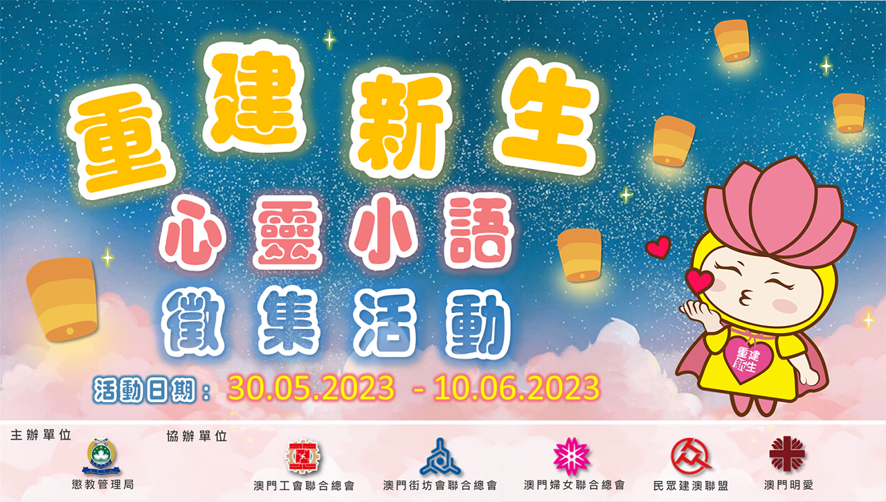 為持續推動社會關注及支持在囚人和院生重建新生,懲教管理局將於5月30日至6月10日期間,聯同澳門工會聯合總會、澳門街坊會聯合總會、澳門婦女聯合總會、民眾建澳聯盟,以及澳門明愛舉辦“重建新生心靈小語”徵集活動,邀請廣大市民於懲教管理局Facebook專頁透過文字留言,支持和鼓勵在囚人及院生改過自新,重建新生。