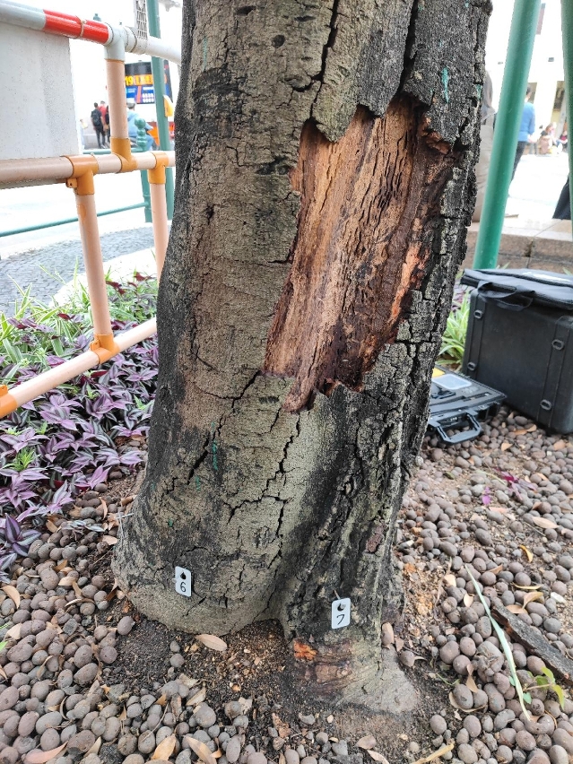市政署持續巡查本澳街道樹木,以維護樹木健康及公共安全。去年發現位於議事亭前地的一株陰香感染根腐病及遭白蟻蛀食為害,導致樹木生長持續衰弱並出現樹皮脫落情況。為使樹木長勢得以恢復,工作人員已為樹木進行修剪、清除真菌子實體、施藥、擴大樹穴、安裝支撐架等一系列救治工作,並定期對該樹進行監測。