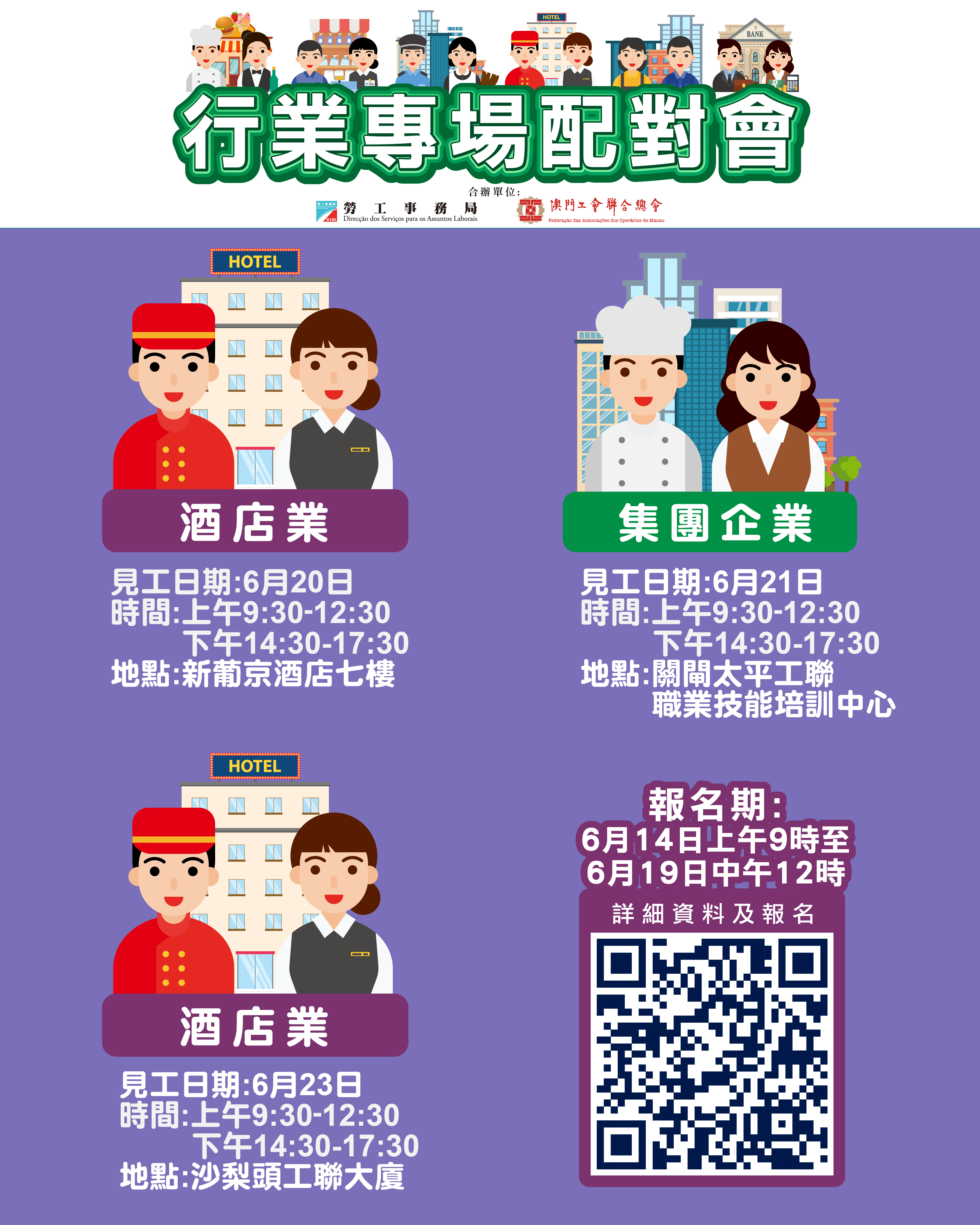 6月20日酒店業配對會在澳門新葡京酒店七樓舉行;6月21日集團企業配對會在澳門工聯職業技能培訓中心(關閘馬路101-105A號太平工業大廈第一期1樓)舉行;6月23日酒店業配對會在澳門工會聯合總會(沙梨頭海邊街2-6號工聯大廈)舉行,報名日期為6月14日上午9時至6月19日中午12時。