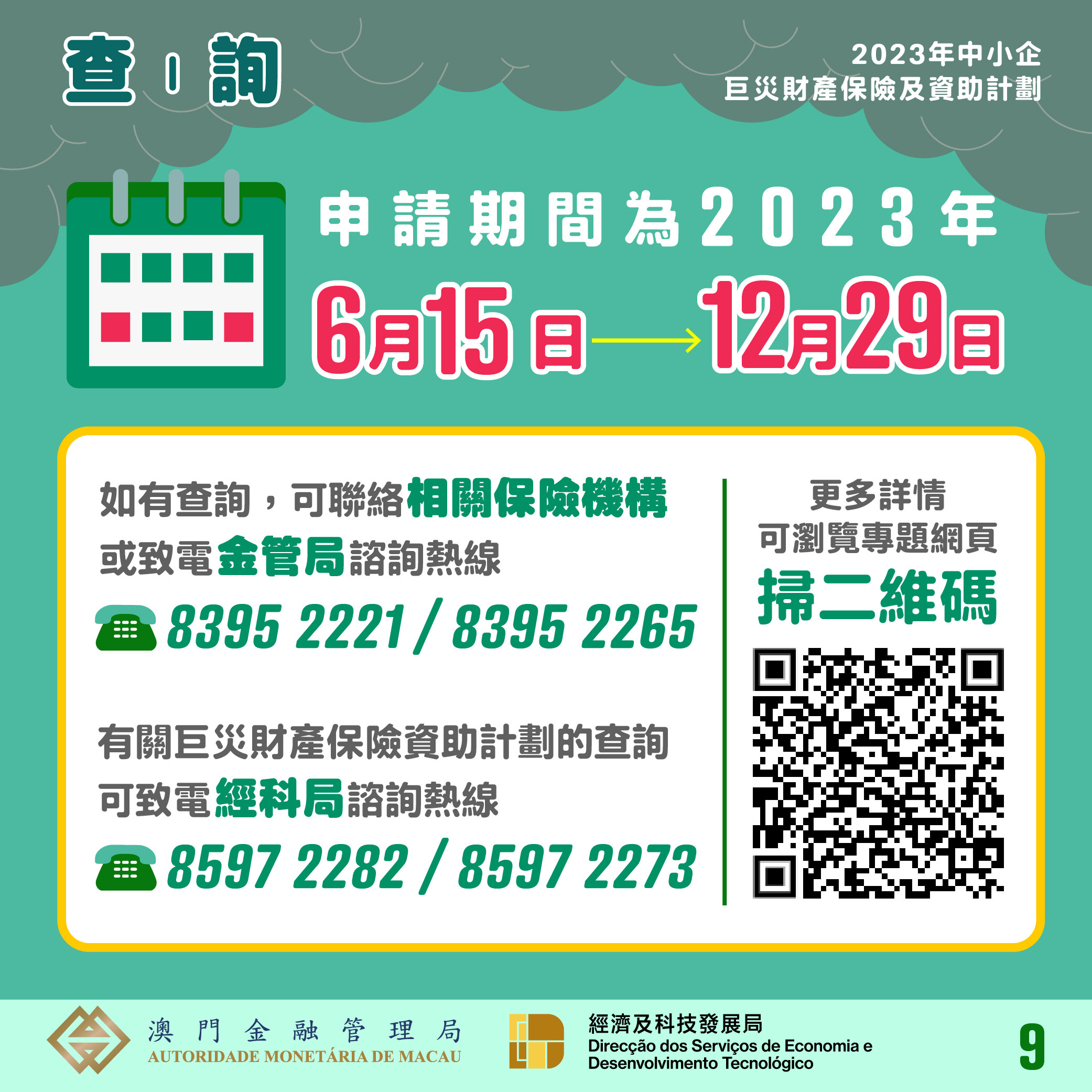 金管局網頁已更新2023年度巨災保險的內容、獲許可提供保險的公司名單,以及資助計劃詳情( https://www.amcm.gov.mo/zh-hant/insurance-sector/sme-catastrophe-property-insurance?type=SME-Catastrophe-Property-Insurance-and-Subsidy-Scheme )。如對“巨災保險”有任何查詢,可直接聯絡相關保險公司,亦歡迎於辦公時間按下列途徑查詢: