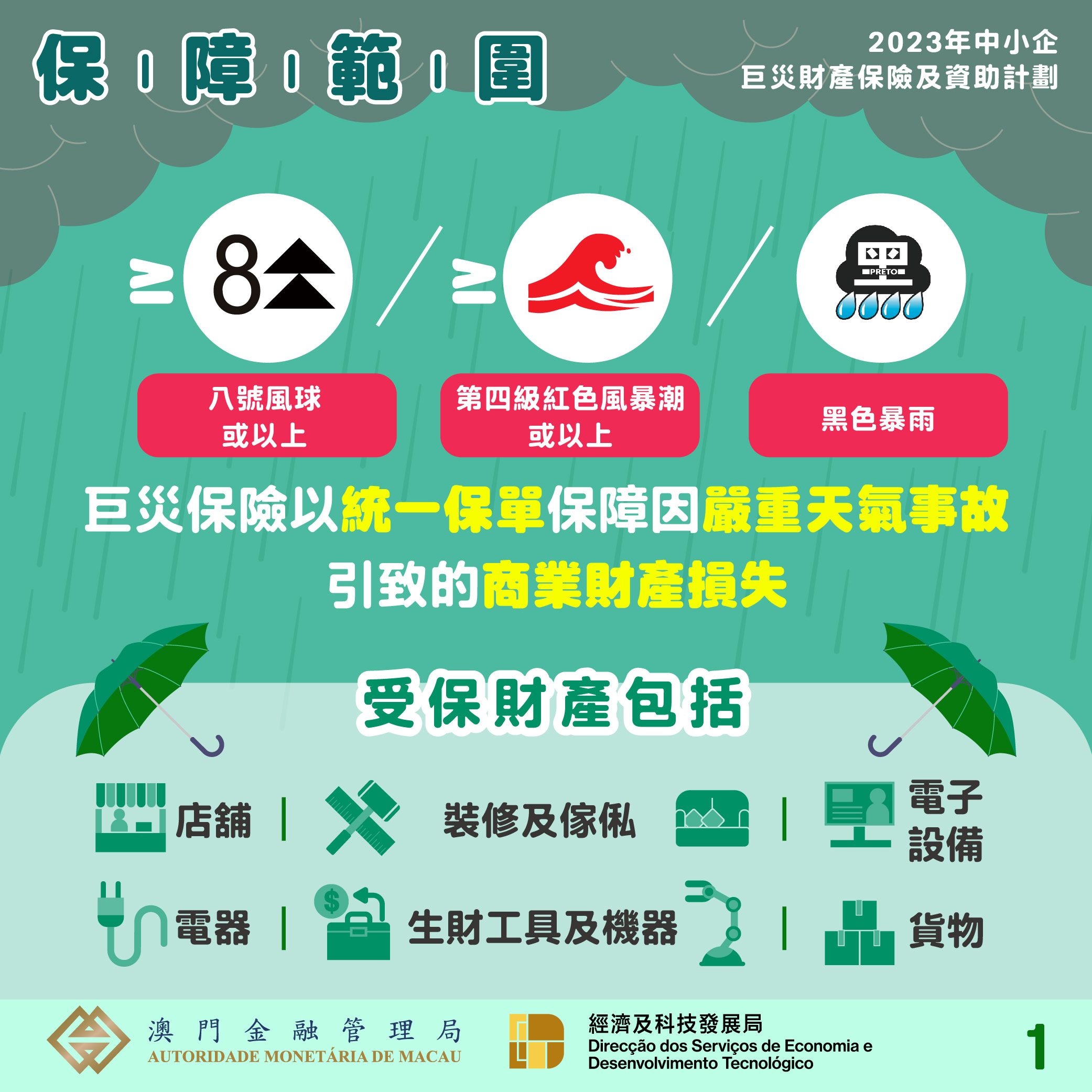 為鼓勵商戶透過商業保險轉移風險,澳門金融管理局聯動保險業界,再次優化中小企巨災財產保險(下稱“巨災保險”)的安排,支持中小企加強保險保障以應對極端氣候風險。2023年度巨災保險的優化安排包括增加保額為50萬澳門元的投保選項,保費率下調四成至15%,以及對特定曾索賠商戶提供一定的續保折扣優惠。同時,工商業發展基金將繼續推出中小企巨災財產保險資助計劃(下稱“資助計劃”),紓緩商戶經濟負擔。