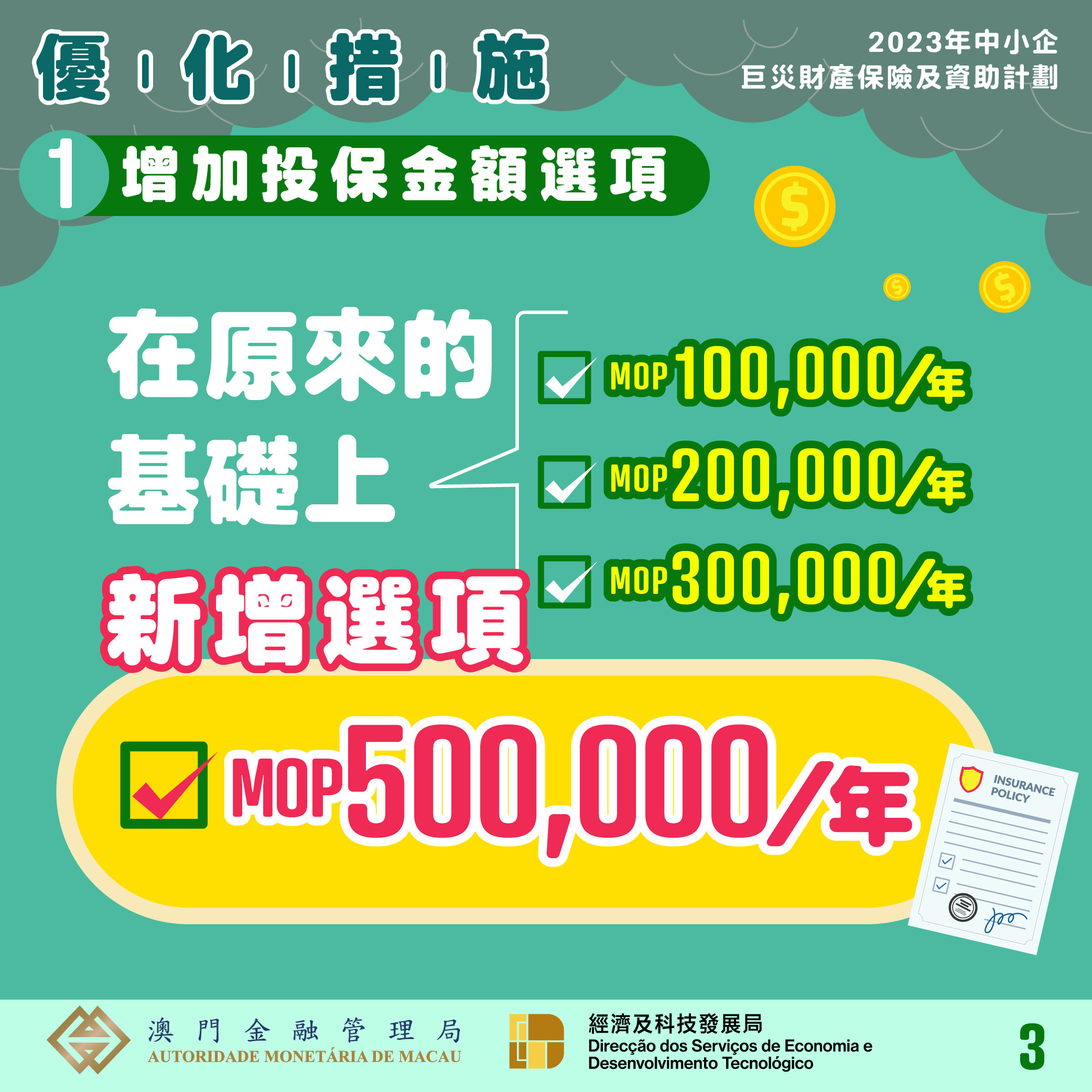 即日起至2023年12月29日,中小企可透過參與2023年度巨災保險的五間本地保險公司,為每一營業場所投保一份巨災保險。除了往年10萬元(澳門元,下同)、20萬元及30萬元的投保金額外,2023年新增了50萬元的保額選項,供商戶選擇購買更大的保障。保費率全面下調四成至15%,對應前述保額的保費相應為15,000元、30,000元、45,000元及75,000元。