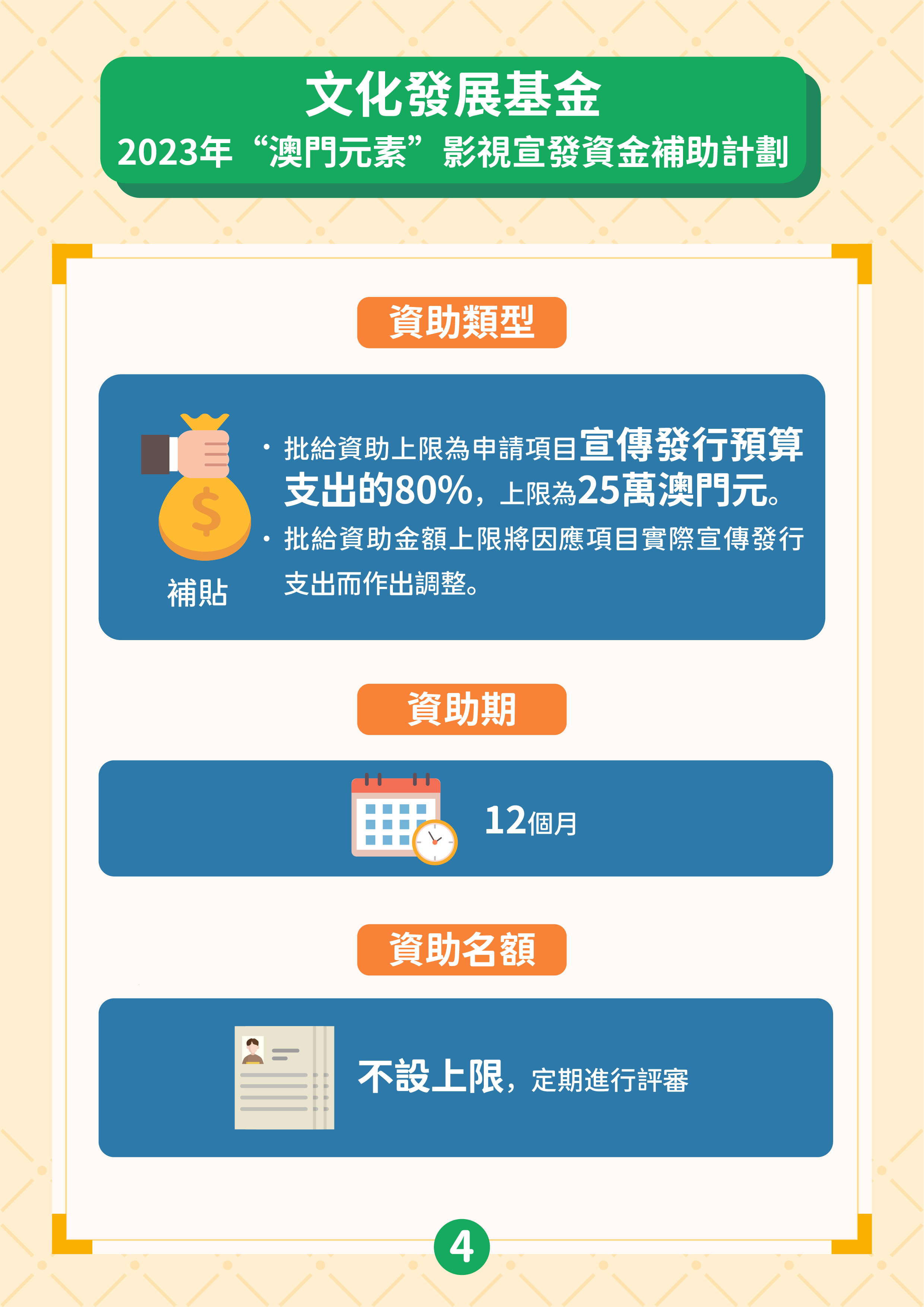 “澳門取景"影視拍攝資金補助計劃的目的是吸引境外拍攝團隊到澳門取景,通過影視作品宣傳推廣澳門形象,提升澳門的國際知名度,並為本地影視企業提供更多參與拍攝外地影視作品的機會。資助計劃接受在申請期開始(2023年6月21日)前、尚未在澳門取景拍攝且在澳拍攝的日數不少於3天的外地影視項目,由外地拍攝團隊主導並來澳參與拍攝工作。資助申請須由作為澳門製片單位的商業企業主提出。獲資助的影視項目須在資助期內完成公開播放,公映版本的片長及片中出現澳門取景點的時長,須符合章程規定的時限要求。批給資助上限為申請項目在澳門進行拍攝取景工作預算支出的40%,上限為200萬澳門元。
