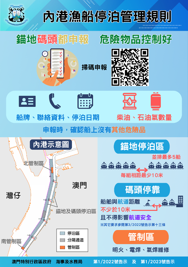 繼去年刊登《告示》規管漁船錨泊內港錨地的安全應遵守則後,為進一步加強內港的漁船安全監管工作,局方今日刊登了第1/2023號《告示》,訂明漁船停靠內港各碼頭的安全應遵守則,包括靠泊前須以電子方式申報,限制漁船靠泊碼頭時燃油的存放方式、設定石油氣存量上限,禁止明火煮食、進行明火的祭祀活動和維修作業等。有關守則與現時漁船停泊內港錨地的要求基本一致。