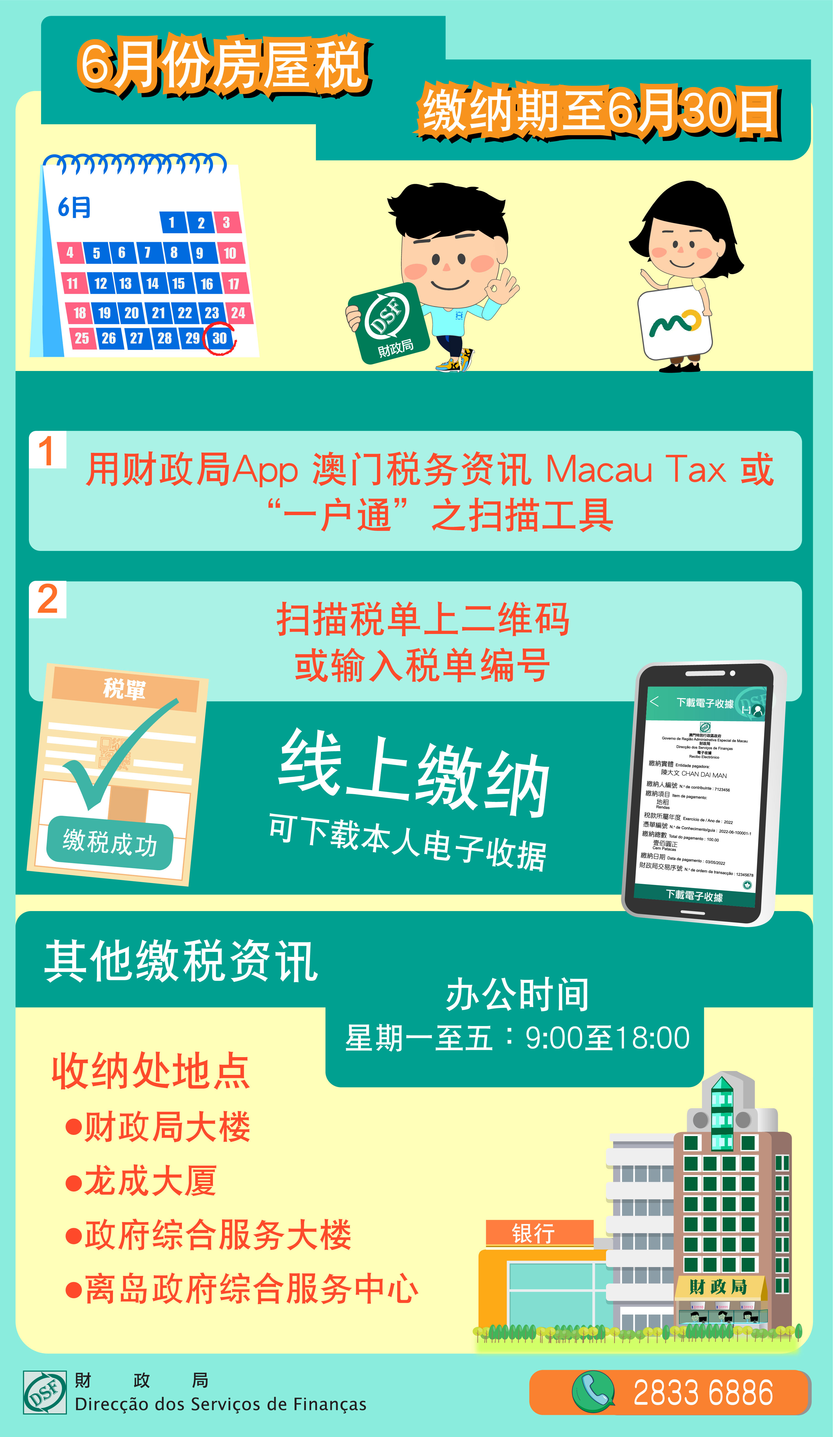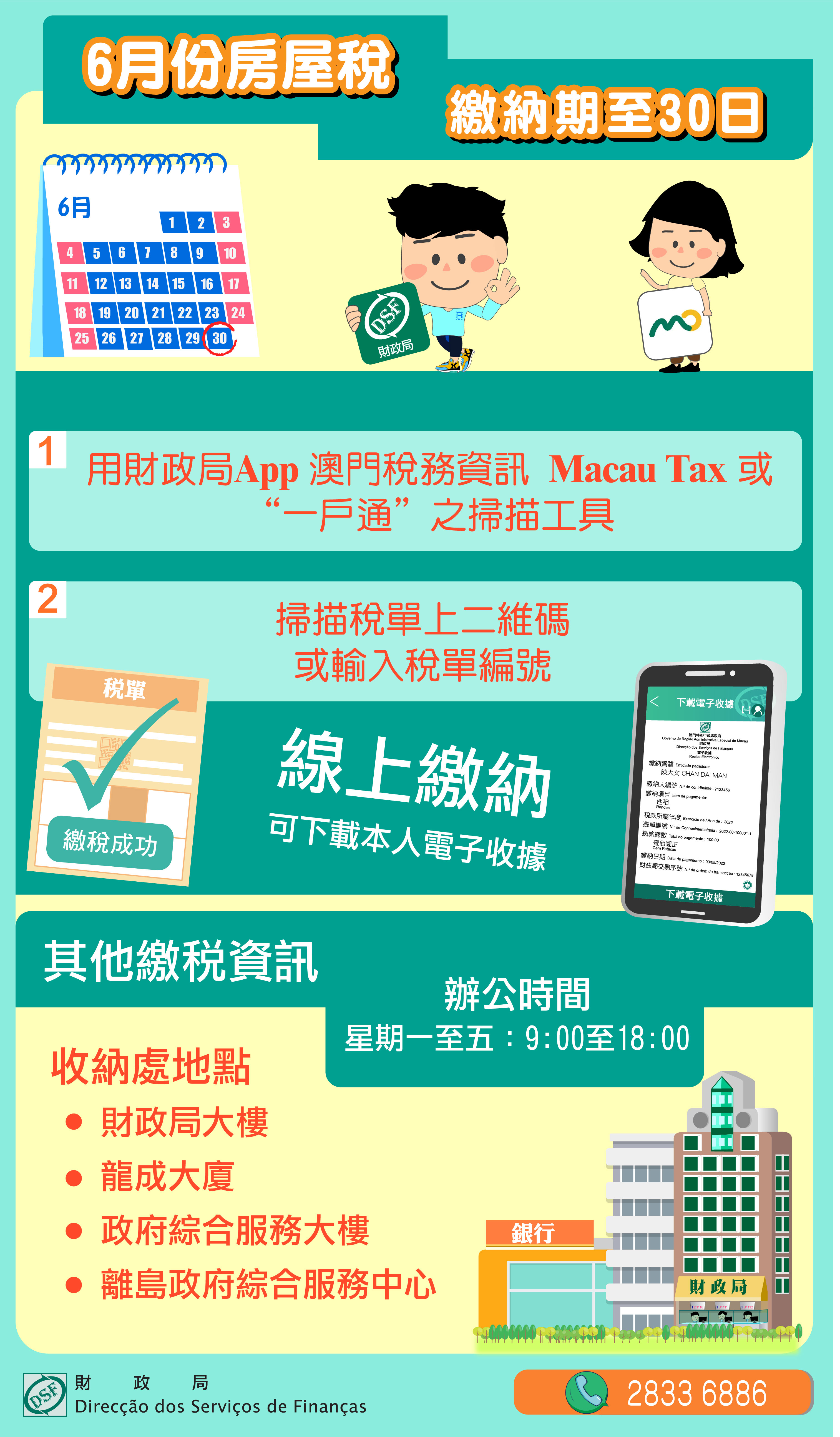 財政局提醒房屋稅納稅人,2022年度房屋稅徵稅憑單上繳納月份屬6月的房屋稅,繳納期限至6月30日屆滿。為免增加排隊輪候時間或因逾期繳納而須附加過期利息和罰款,仍未繳納之納稅人應儘快繳納。
