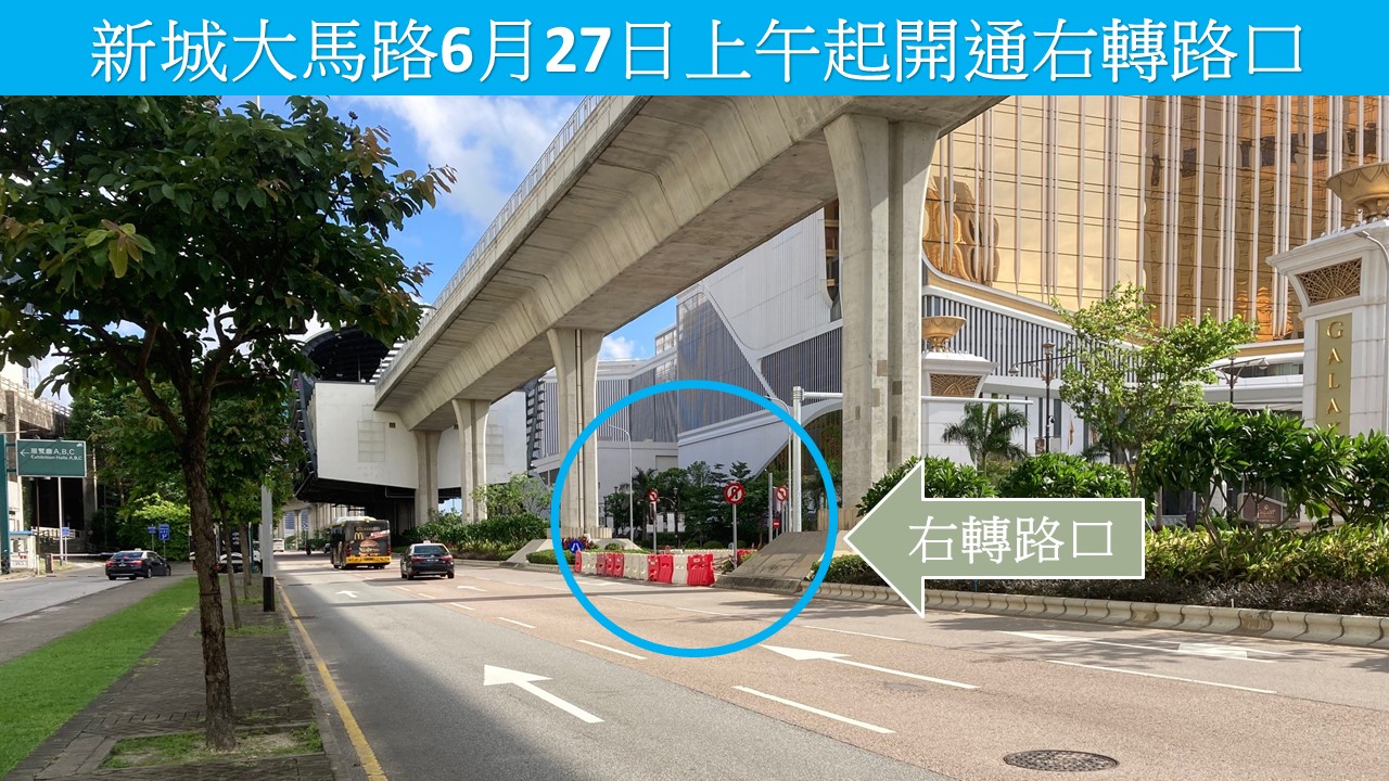 為進一步提升路氹城一帶的行車通達性,交通事務局於6月27日(周二)上午完工後開通新城大馬路近輕軌“路氹西”站的右轉路口。另外,為保障行車安全和通行效率,局方將在該右轉位置同步啟用交通燈。