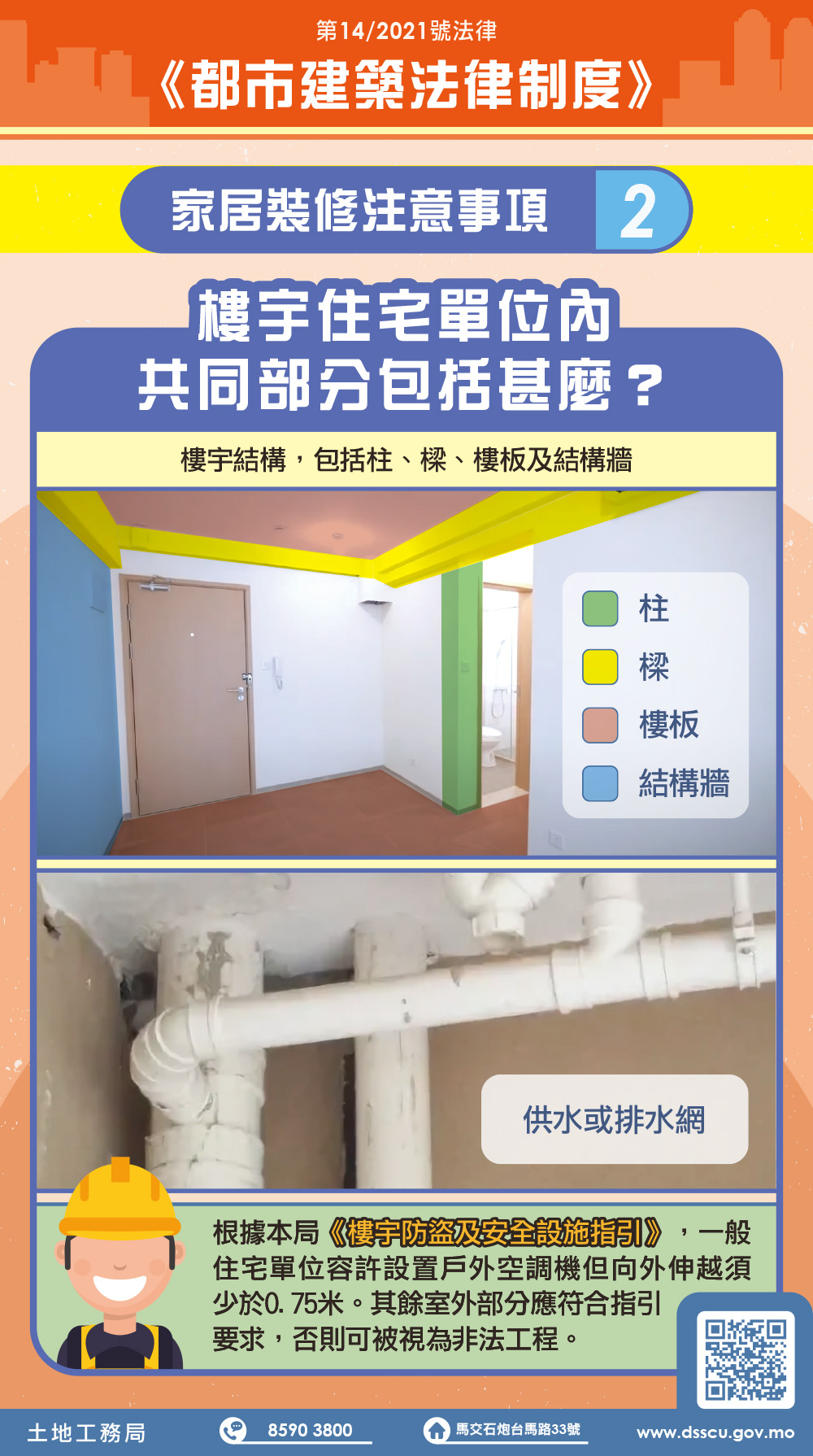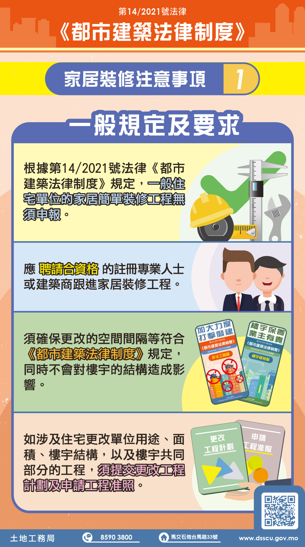 土地工務局呼籲物業管理單位應嚴格把關建築物所在的裝修等工程,主動對工程人員作登記等管理措施,通知住戶有關裝修應遵守事項,並加強巡查,及時掌握現場是否有進行非法工程。開展工程的小業主亦有義務透過合同訂立責任條款,明確禁止裝修承辦商作出相關違法行為及盡責監督裝修工程實施。市民如需更多資訊,可查閱土地工務局網站及站內 “《都市建築法律制度》資訊網”(https://www.dsscu.gov.mo/zh_HANT/sites/rjcu),或致電本局服務中心查詢,電話:8590 3800。