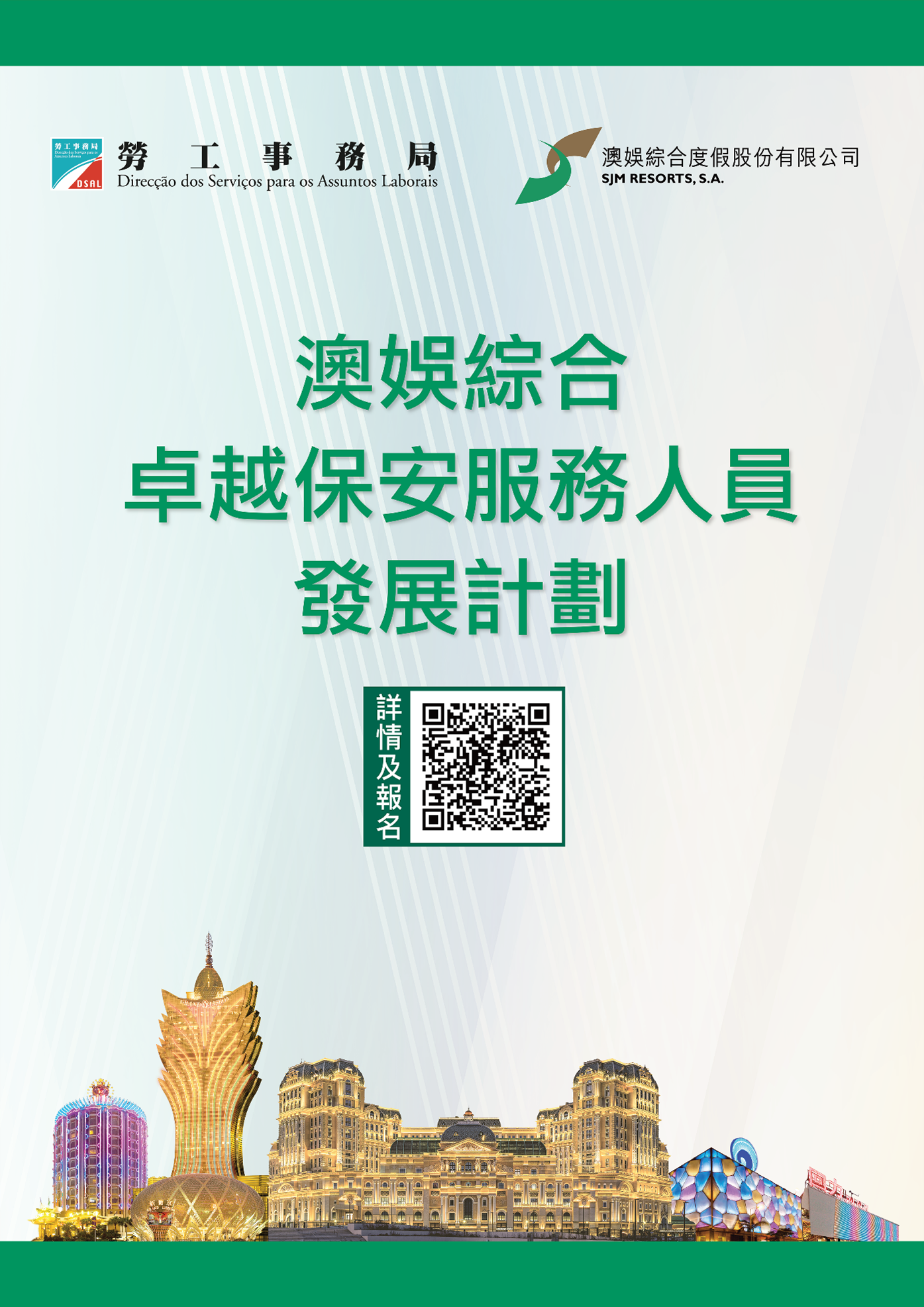 隨著本澳旅遊業穩步復甦,訪澳旅客人數增加,為提供優質接待服務和維護公共場所的安全,休閒娛樂綜合體對保安服務人員的需求亦隨之增加。勞工事務局和澳娛綜合度假股份有限公司合作推出“澳娛綜合卓越保安服務人員發展計劃",以“先入職、後培訓”方式,協助符合條件和有意從事保安服務的澳門居民就業,計劃由6月30日起接受申請。