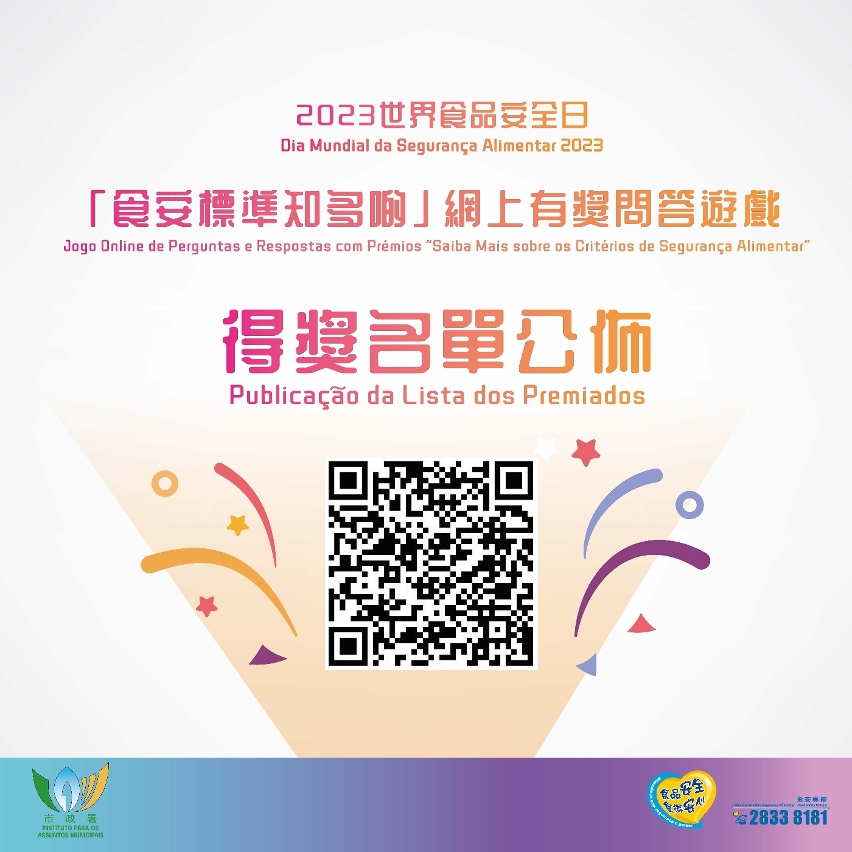 為響應“世界食品安全日”,市政署於六月七日至六月廿一日舉辦“食安標準知多啲” 網上有獎問答遊戲,讓參與者在遊戲中認識本澳食安標準,建立科學、理性的食安觀念。遊戲活動共吸引逾八千七百人次參與,日前透過電腦隨機抽出一百一十名得獎者,得獎名單已上載至市政署食安資訊網 www.foodsafety.gov.mo;同時,得獎者亦會收到手機短訊通知。