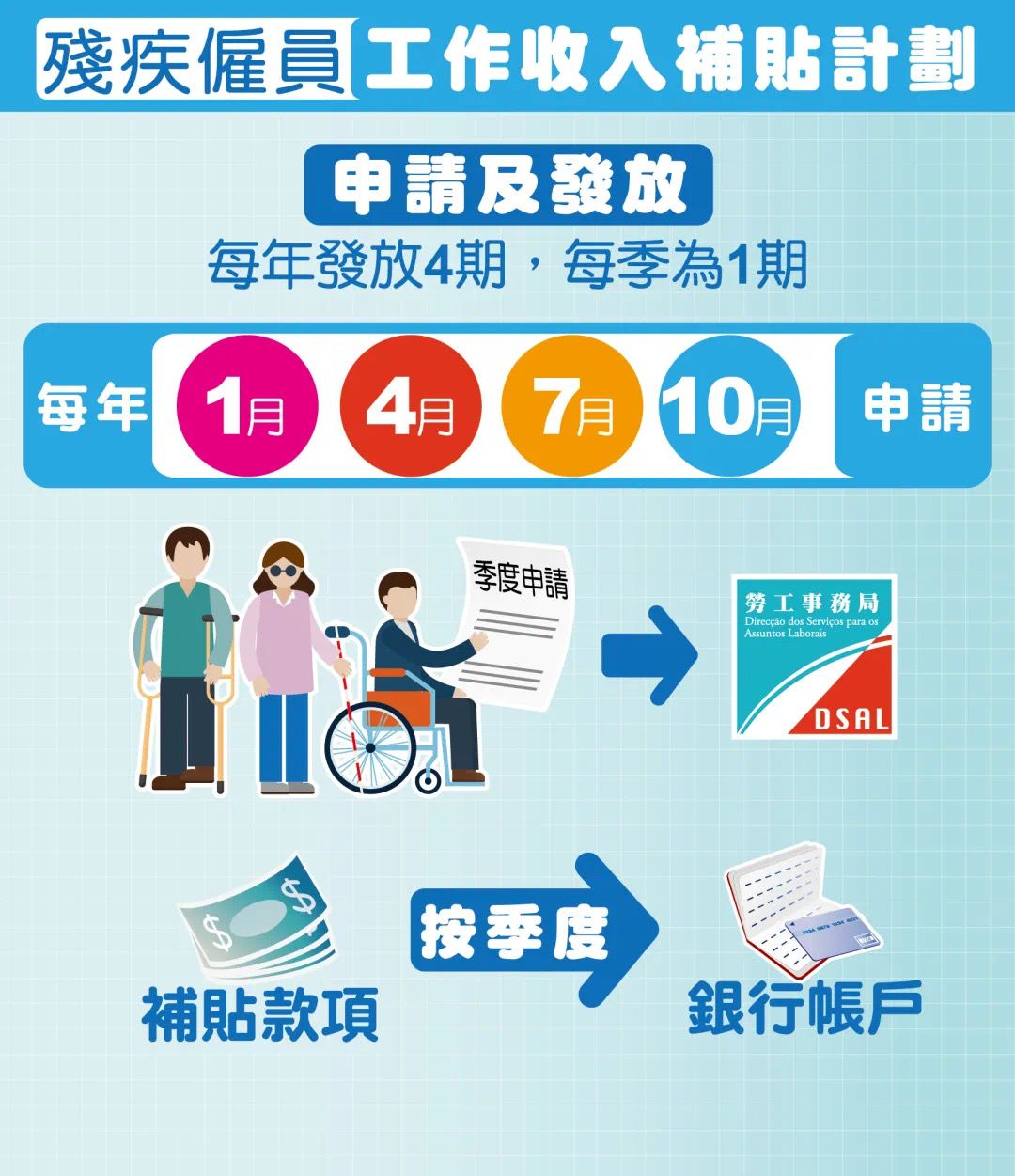 為支援殘疾人士就業,讓殘疾僱員獲得最基本的工資保障,特區政府於2020年11月1日推出《殘疾僱員工作收入補貼計劃》行政法規。根據規定,每年1月、4月、7月及10月接受前一季度的收入補貼申請,符合資格的殘疾僱員可於2023年7月3日至31日向勞工事務局申請2023年第二季的工作收入補貼。