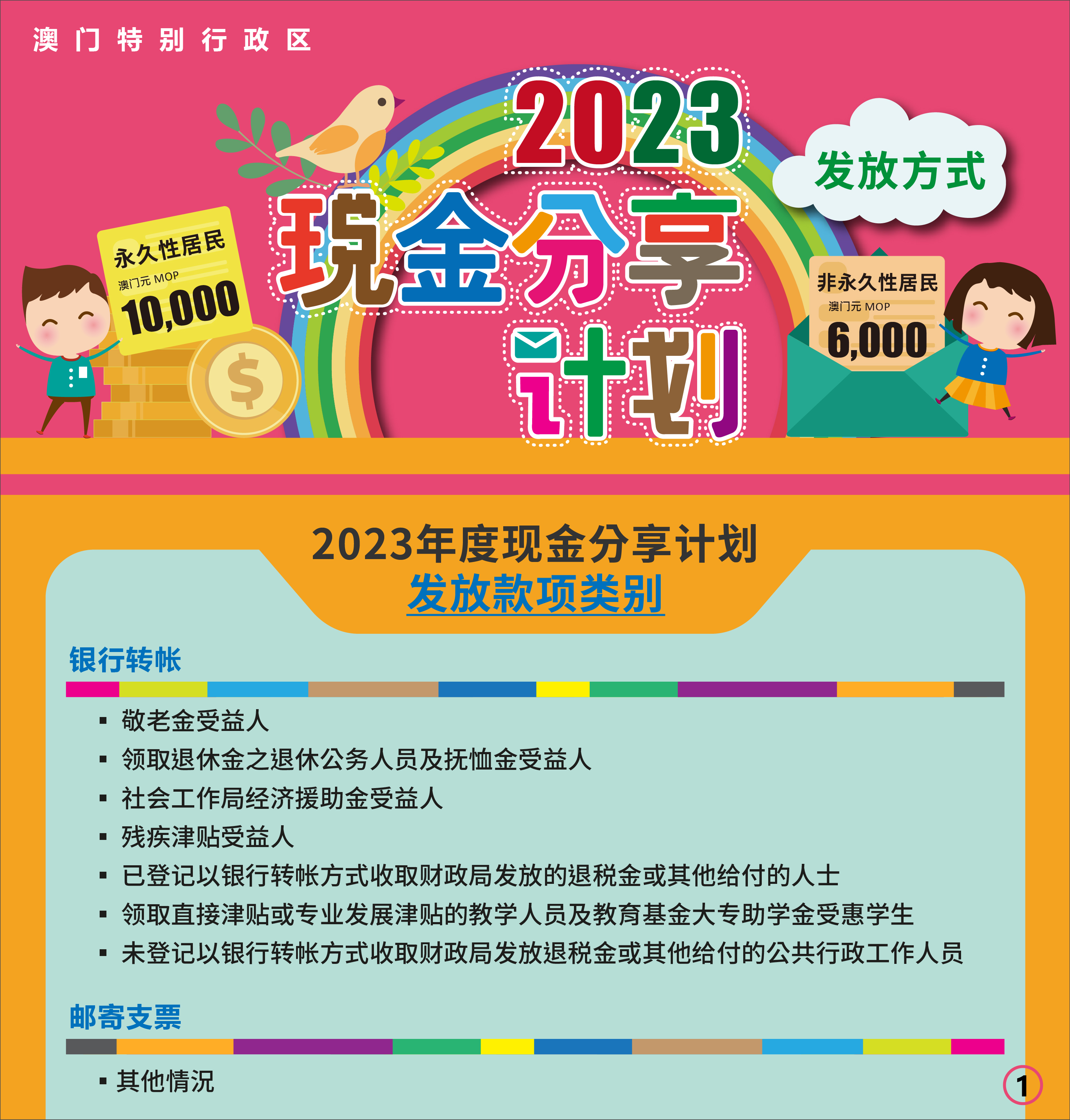 其餘合資格的澳門特別行政區居民,則通過郵寄方式寄送劃線支票。其中: