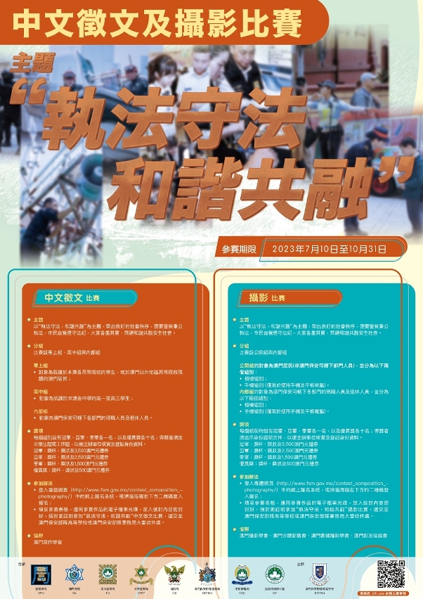為更好地推動警隊文化建設的工作,增強警民的責任意識,傳達和諧共融安全社會,構建良好的警民關係,澳門保安部隊及保安部門今年舉辦的中文徵文比賽及攝影比賽以“執法守法,和諧共融”為題,旨在帶出良好的社會秩序,需要警察秉公執法,市民自覺遵守法紀,大家各盡其責,齊建和諧共融安全社會。兩項比賽的徵集期均於2023年7月10日至10月31日期間接受報名,歡迎踴躍參與。