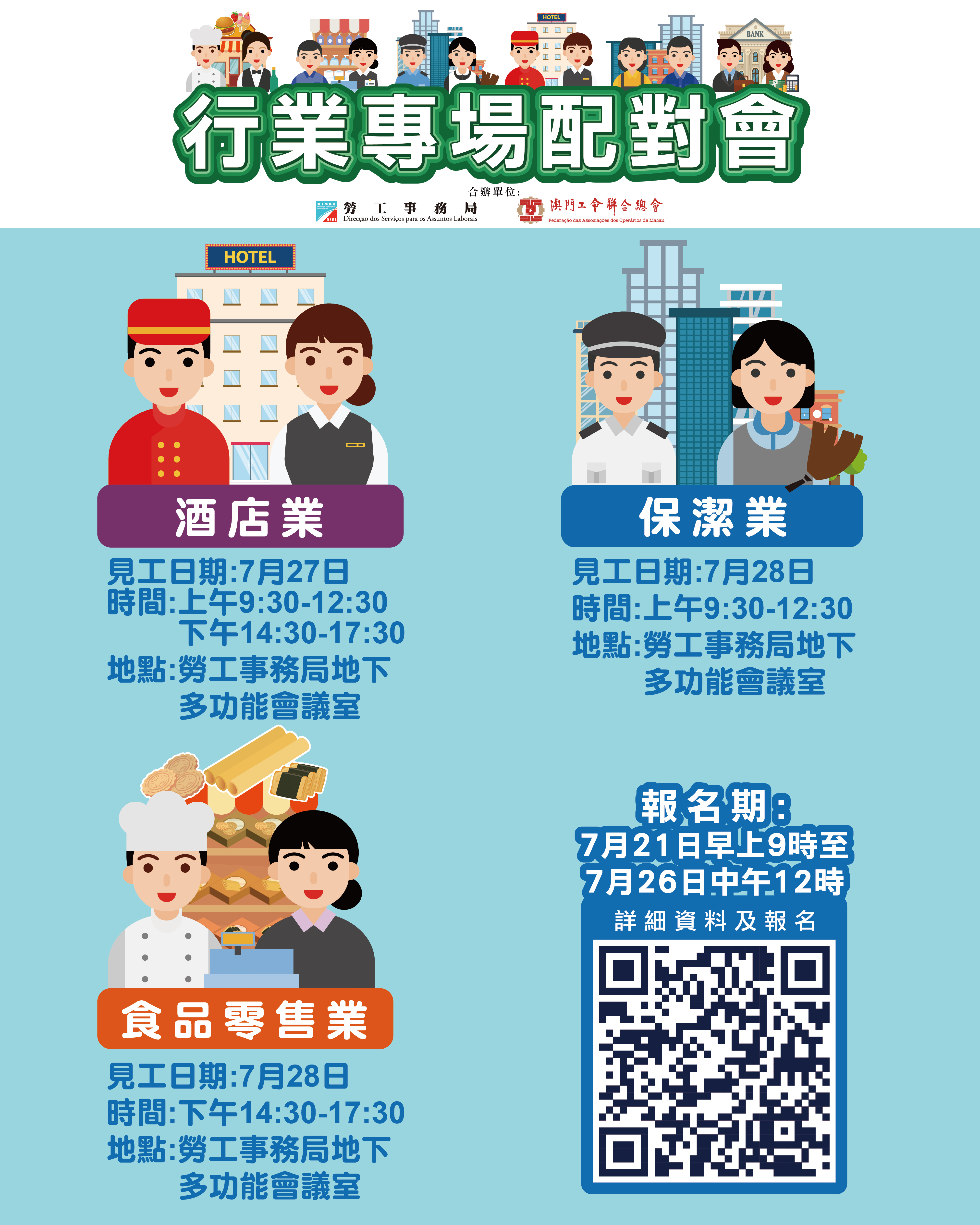 為協助有求職需求的澳門居民盡快就業,以及為緩解業界的人資需求的壓力,勞工事務局與澳門工會聯合總會合作,7月第四周舉辦3場行業專場配對會,合共提供433個空缺,報名日期為7月21日上午9時至7月26日中午12時。