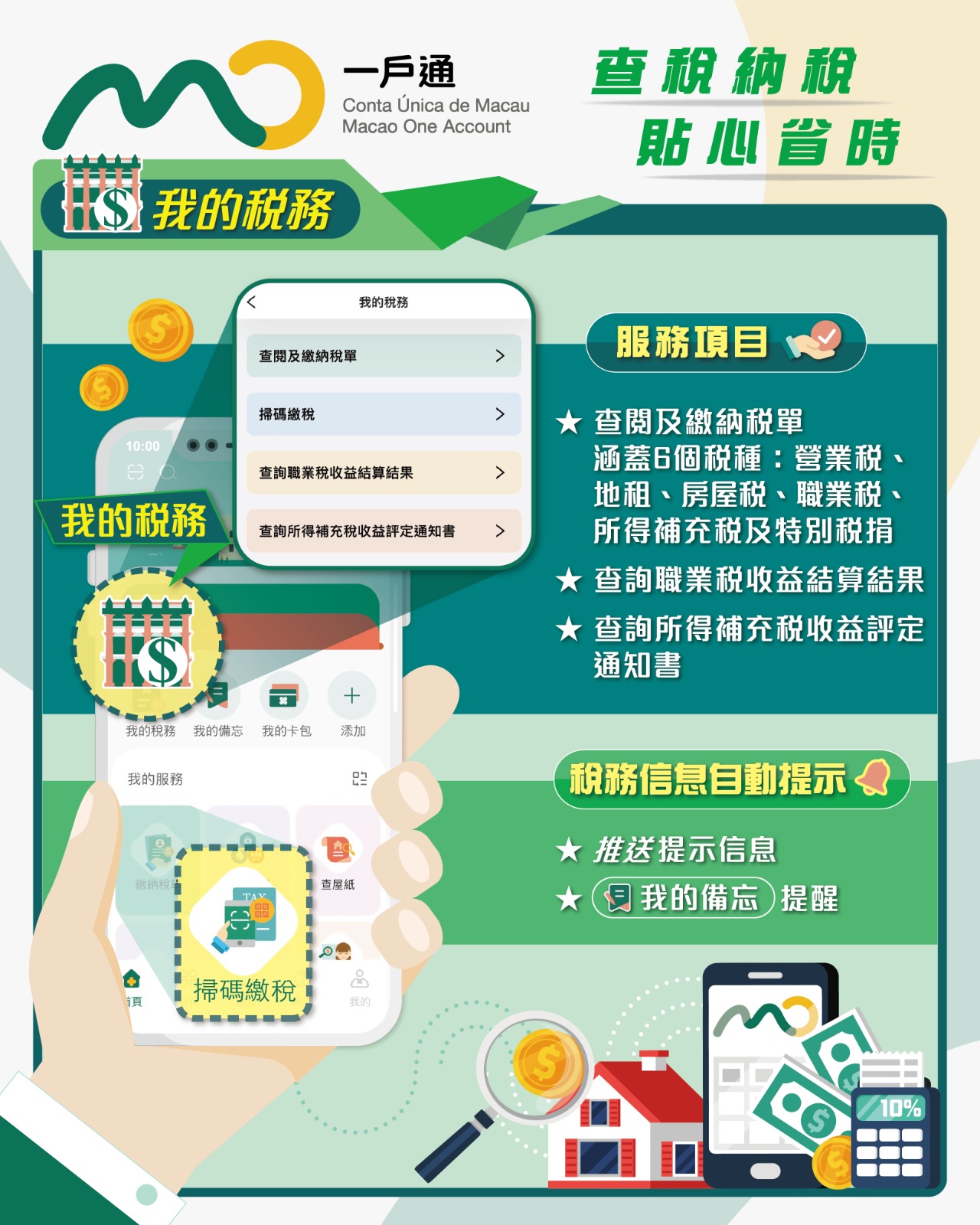 “一戶通”除可繳交行車稅、房屋稅、職業稅等不同稅務項目外,亦開通了水、電、天然氣、澳門電訊有限公司及中國電信(澳門)有限公司的繳費服務。“一戶通”的繳費功能自2022年推出至今,總使用數量為10.7萬,支付金額逾3.5億澳門元。