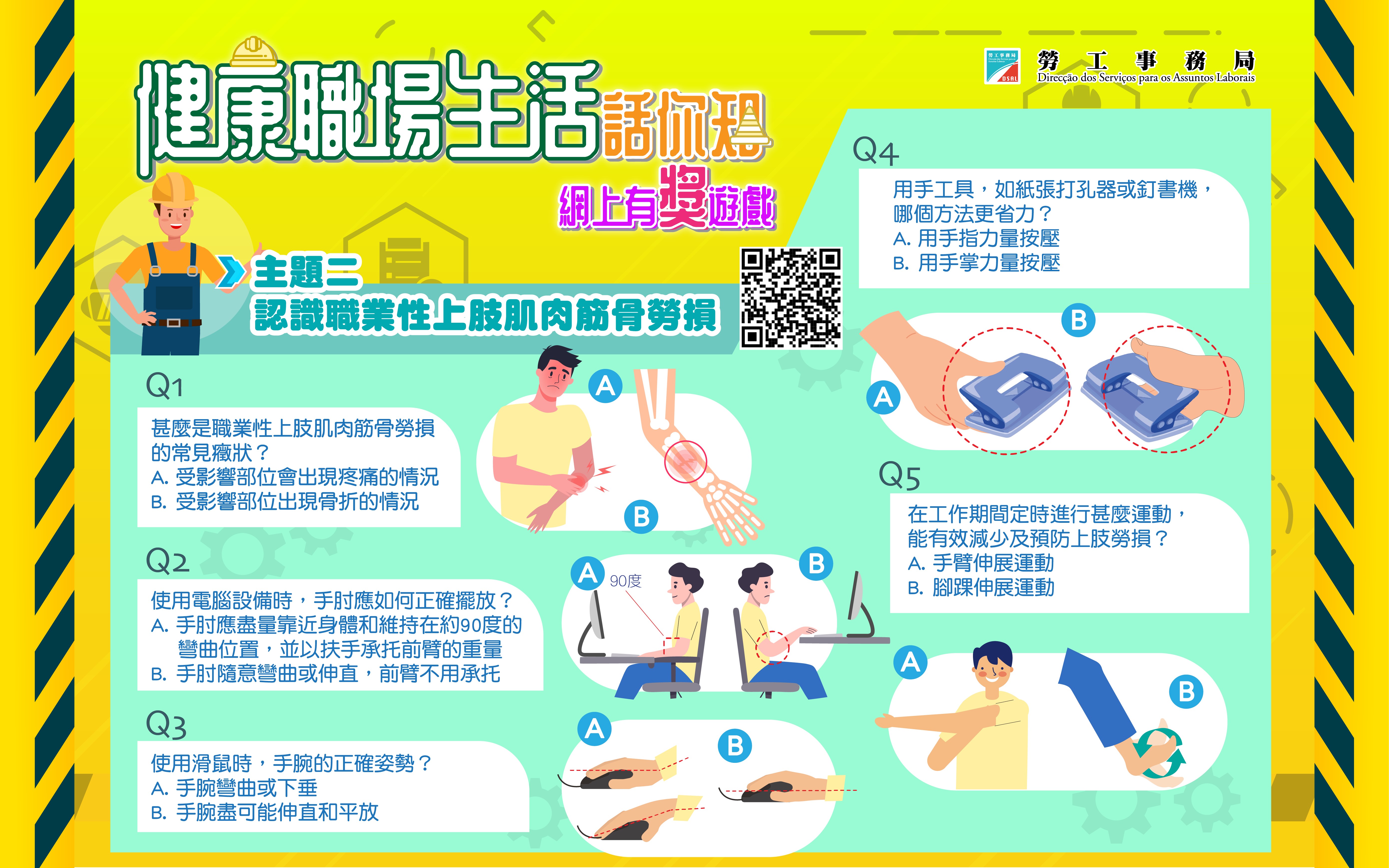 為持續提升市民對職業健康的關注,勞工局由7月24日起至9月3日期間推出第二期有奬遊戲,主題為“認識職業性上肢肌肉筋骨勞損”。歡迎有興趣的市民可透過勞工局手機應用程式或掃描二維碼參與遊戲。
