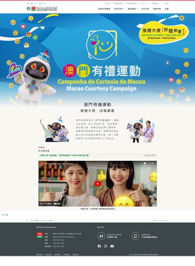 “澳門有禮運動” 專屬網頁已推出,居民和旅客可登入網址https://www.macaotourism.gov.mo/zh-hant/article/promotion/macao-courtesy 獲得相關資訊。