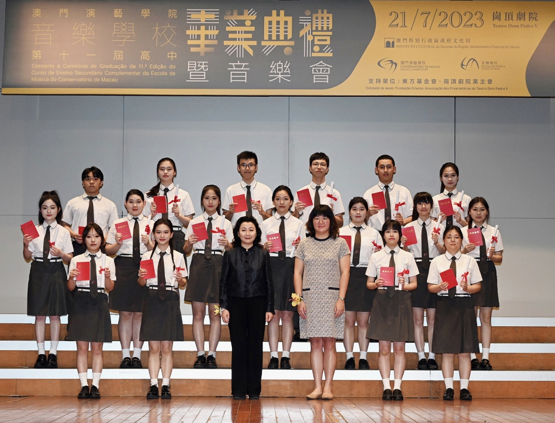 文化局轄下澳門演藝學院音樂學校於7月21日在崗頂劇院舉行“第十一屆高中畢業典禮暨音樂會”,社會各界人土及眾家長蒞臨支持祝賀。
