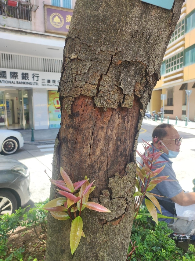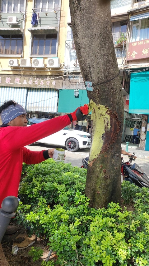 巿政署樹木養護人員近日巡查複檢,發現三盞燈休憩區內兩株蒲桃樹的樹皮萎縮及壞死的範圍擴大,樹幹木質部外露,有乾裂紋,樹冠部份葉片變黃和乾枯。養護人員已對樹木採取藥物救治,鑒於兩株蒲桃樹木結構存有安全風險,將採取疏剪樹冠以減輕重量及受風面積,並持續監察樹木變化。同時,亦於樹木旁張貼告示,請巿民留意。