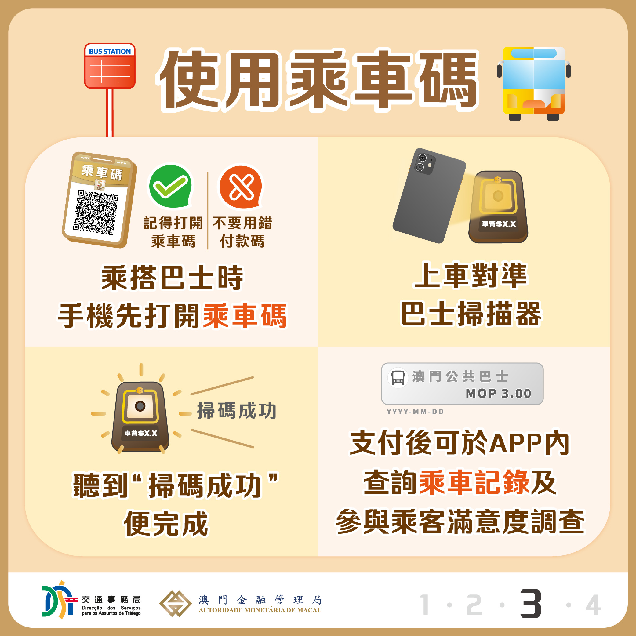 為便利乘客使用乘車碼,交通事務局已於“巴士報站”APP內,加入跳轉至“乘車碼”頁面的功能;乘客在完成支付車資後24小時內,亦可透過支付工具APP連結至交通事務局填寫問卷,以表達對巴士服務的意見。