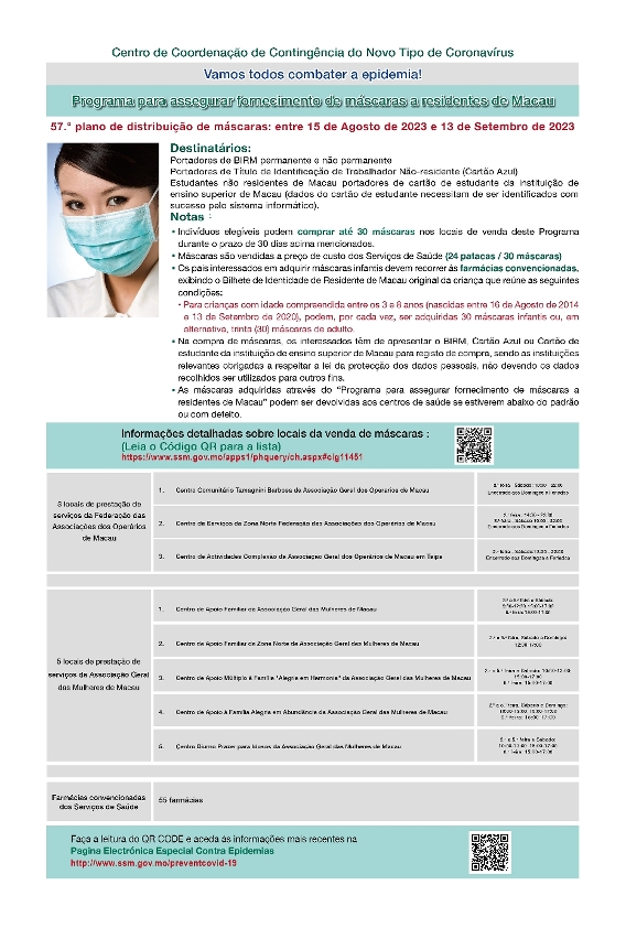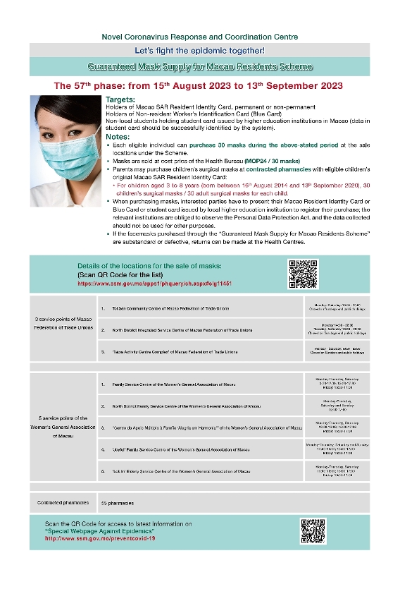 新型冠狀病毒感染應變協調中心(下稱應變協調中心)今(14)日公佈,第57輪保障口罩供應澳門居民計劃(下稱“口罩計劃”)於明(15)日開始,具體如下: