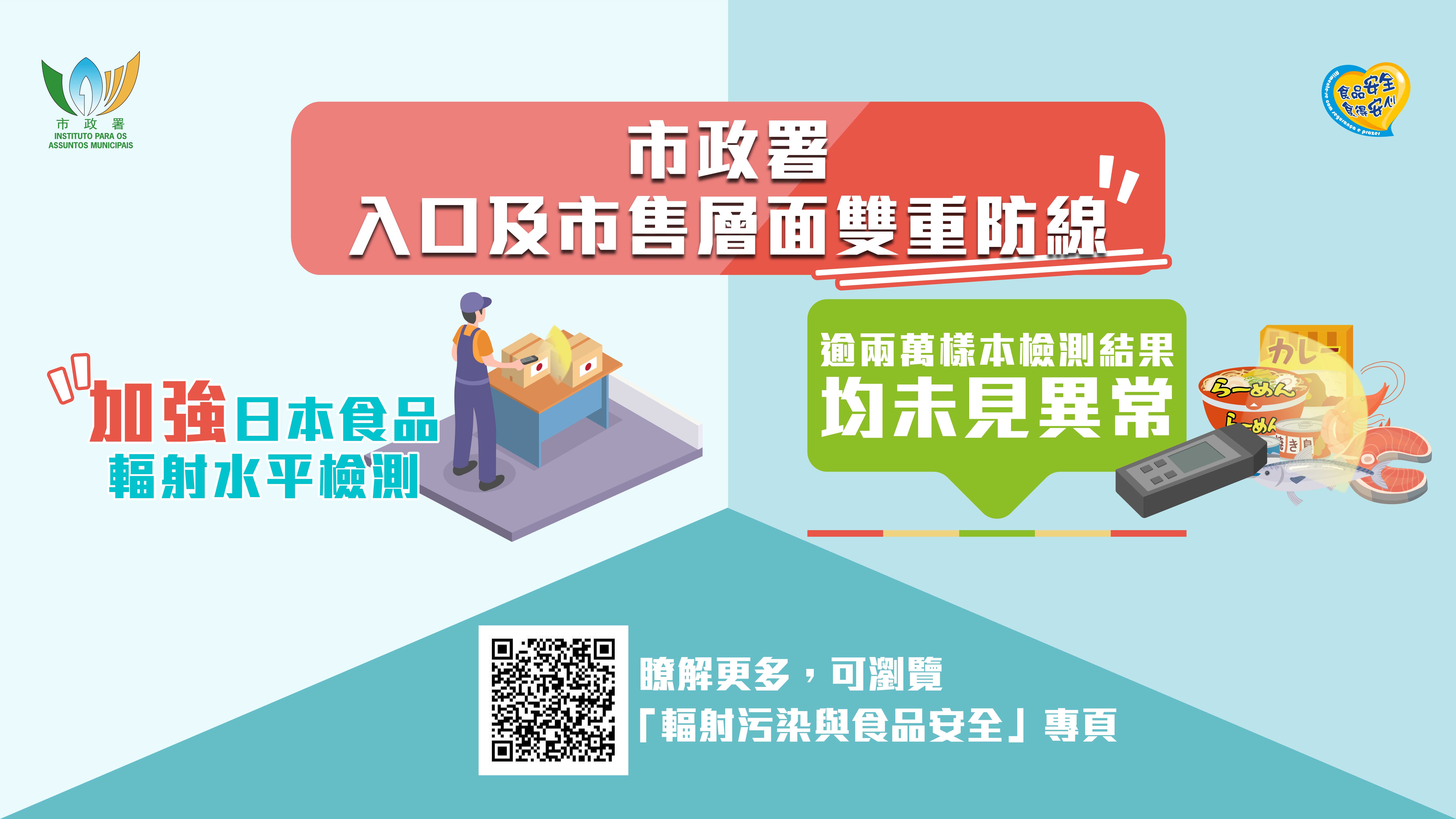 由年初起,市政署一直在進口、零售兩個層面加強監測日本進口食品中的放射性物質,已增加針對特定放射性核素的測量,列作食安常規性檢測項目,並派員在國際機場及內港碼頭等口岸用輻射測量儀器檢測每批每箱產品,由今年一月一日至八月二十一日,已對約23,137個日本進口食品樣本進行輻射檢測,並抽取約160個樣本進行放射性核素檢測,均未發現異常。