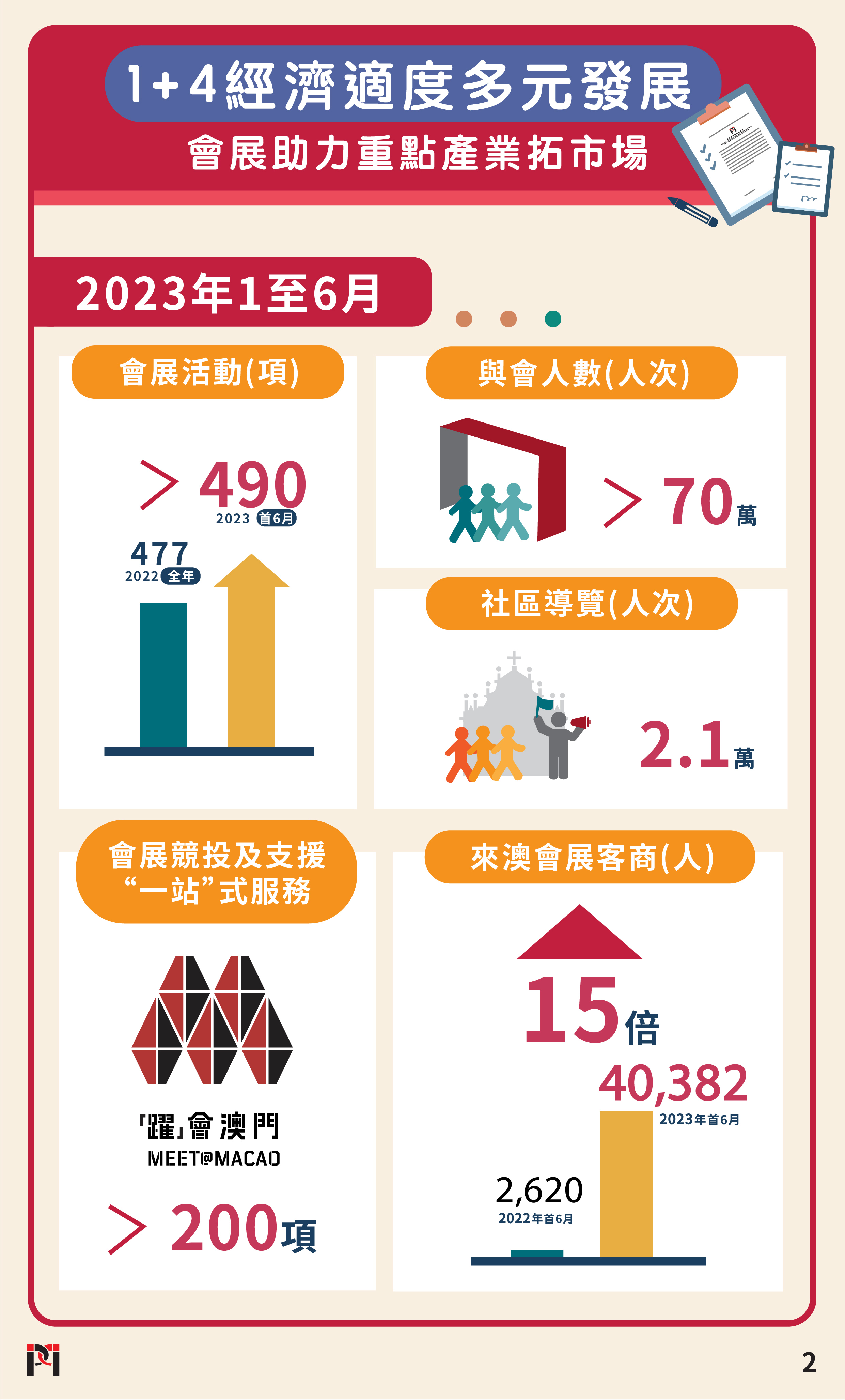 2023年首6月會展活動逾490項,已超去年全年477項,與會者逾70萬人次,同比增長達5成。全年預計有逾1,000項會展活動在澳舉辦,當中超過100項涵蓋旅遊、大健康、高新技術、現代金融、文化體育等產業,以有利培育本澳四大產業和大灣區重點產業的會展活動為着力點,引進國際性、區域性及粵港澳大灣區的專業會展活動,其中9項活動以“一會展兩地”方式進行。