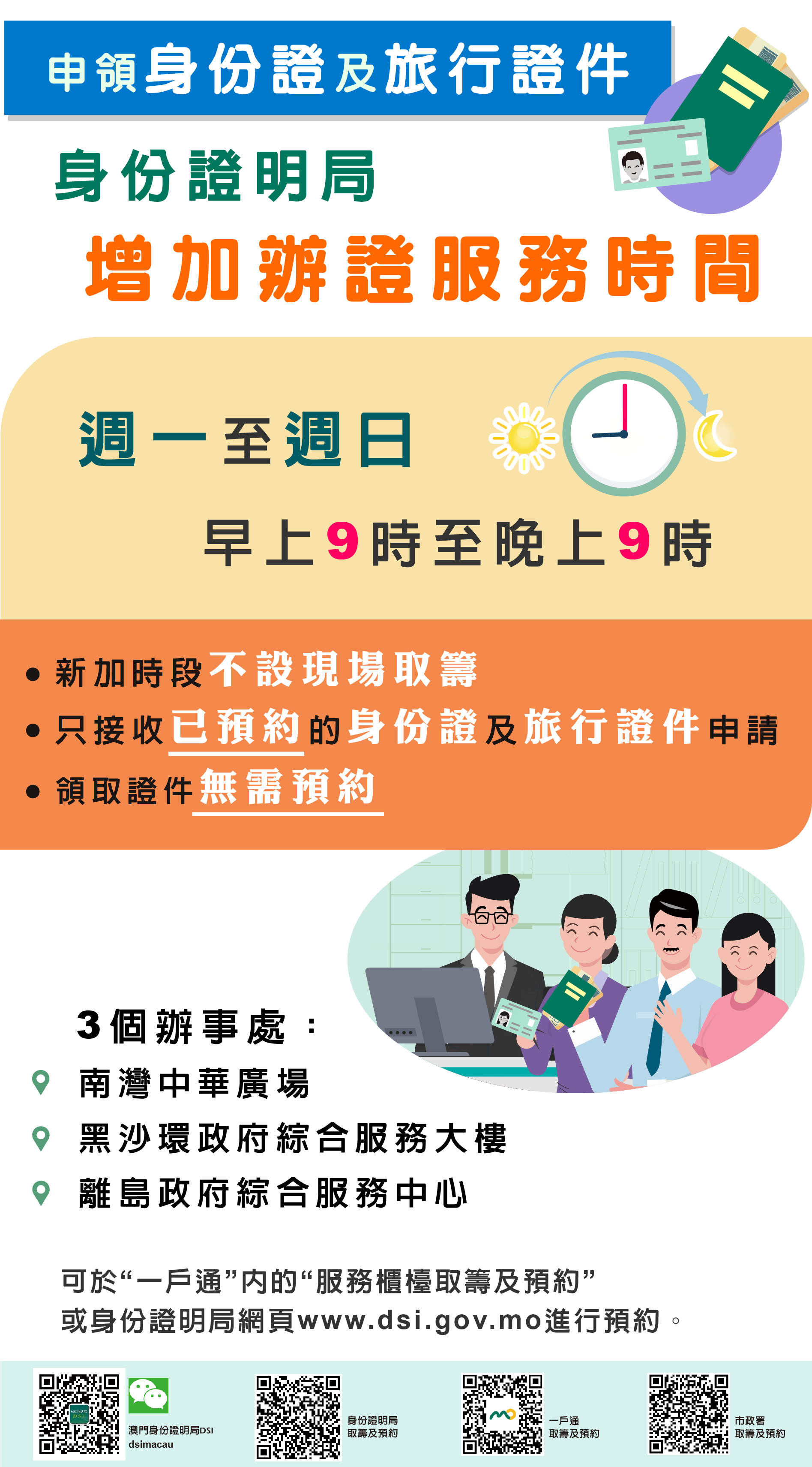 新增加的服務時段,僅接受身份證、旅行證件及澳門居民往來香港特別行政區旅遊證的首次及換證申請,為優先舒緩預約申請的需求,暫不設現場取籌,但在上述時間領取證件無需預約。市民可於“一戶通”內的“服務櫃檯取籌及預約”或身份證明局網頁www.dsi.gov.mo預約有關的辦證服務,合資格人士可優先使用“一戶通”或自助服務機電子辦證,如有查詢,可致電身份證明局熱線2837-0777或2837-0888。