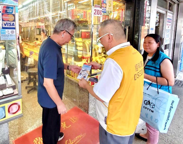 經科局和生產力中心聯同地區商會代表,在司打口及下環街一帶,向商戶派發宣傳單張,並特別提醒位處低窪地區的商戶,應及早做好防風防洪防浸的準備工作及預防措施,有備無患,以免造成貨物及設備損失。