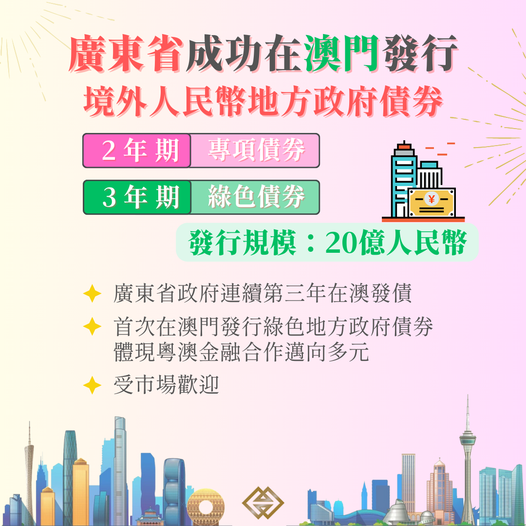 廣東省人民政府今(31)日成功在澳門特區發行離岸人民幣地方政府債券,是繼2021年及2022年後,廣東省政府連續第三年在澳門發行境外人民幣地方政府債券,也是首次在澳門發行綠色地方政府債券。澳門金融管理局對債券的成功發行表示祝賀,並感謝國家財政部、廣東省人民政府對澳門發展現代金融的支持。