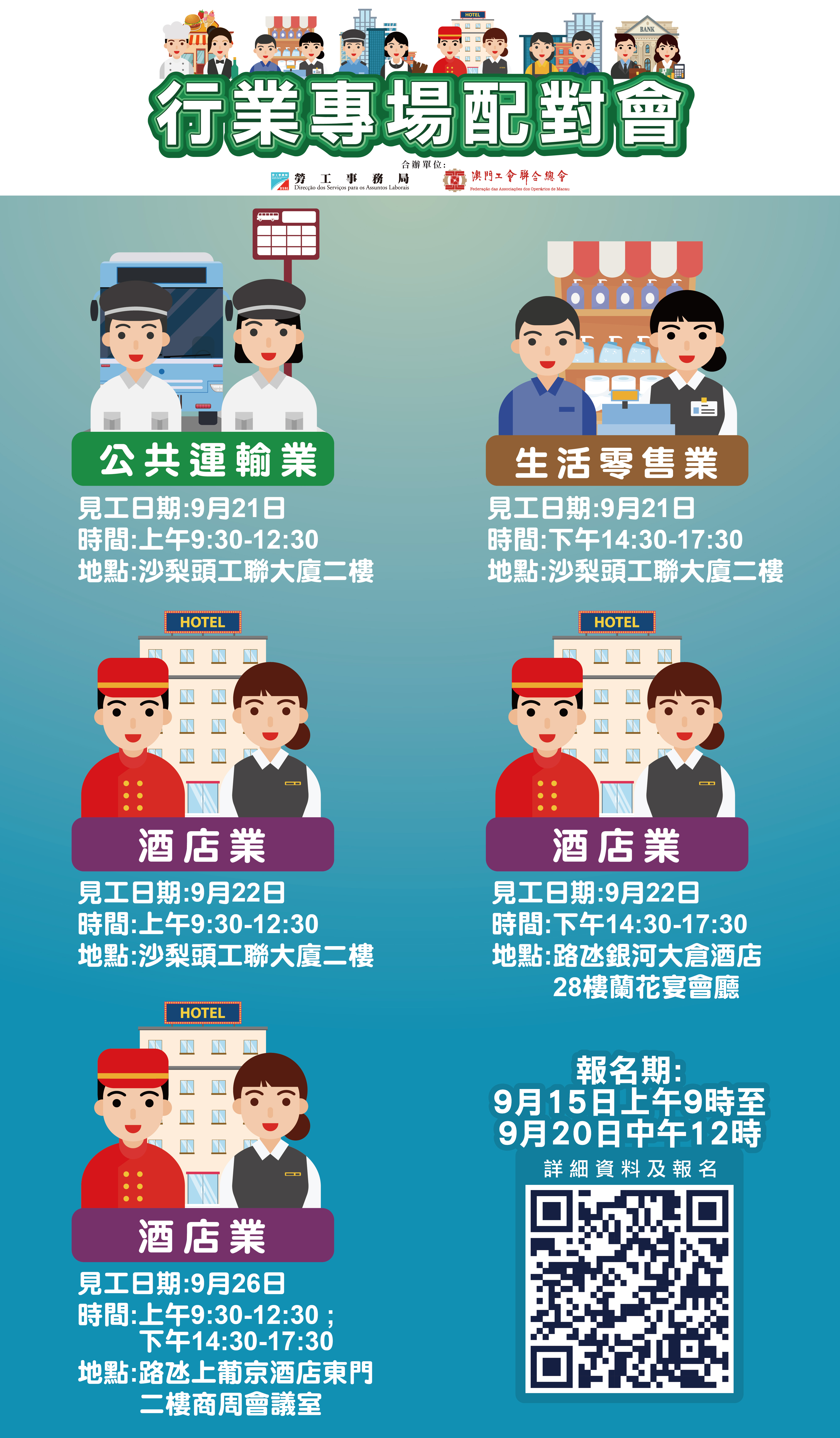 為協助有求職需求的澳門居民盡快就業,以及為緩解業界的人資需求的壓力,勞工事務局與澳門工會聯合總會合作9月續辦5場行業專場配對會,合共提供661個空缺。報名日期為9月15日上午9時至9月20日中午12時。
