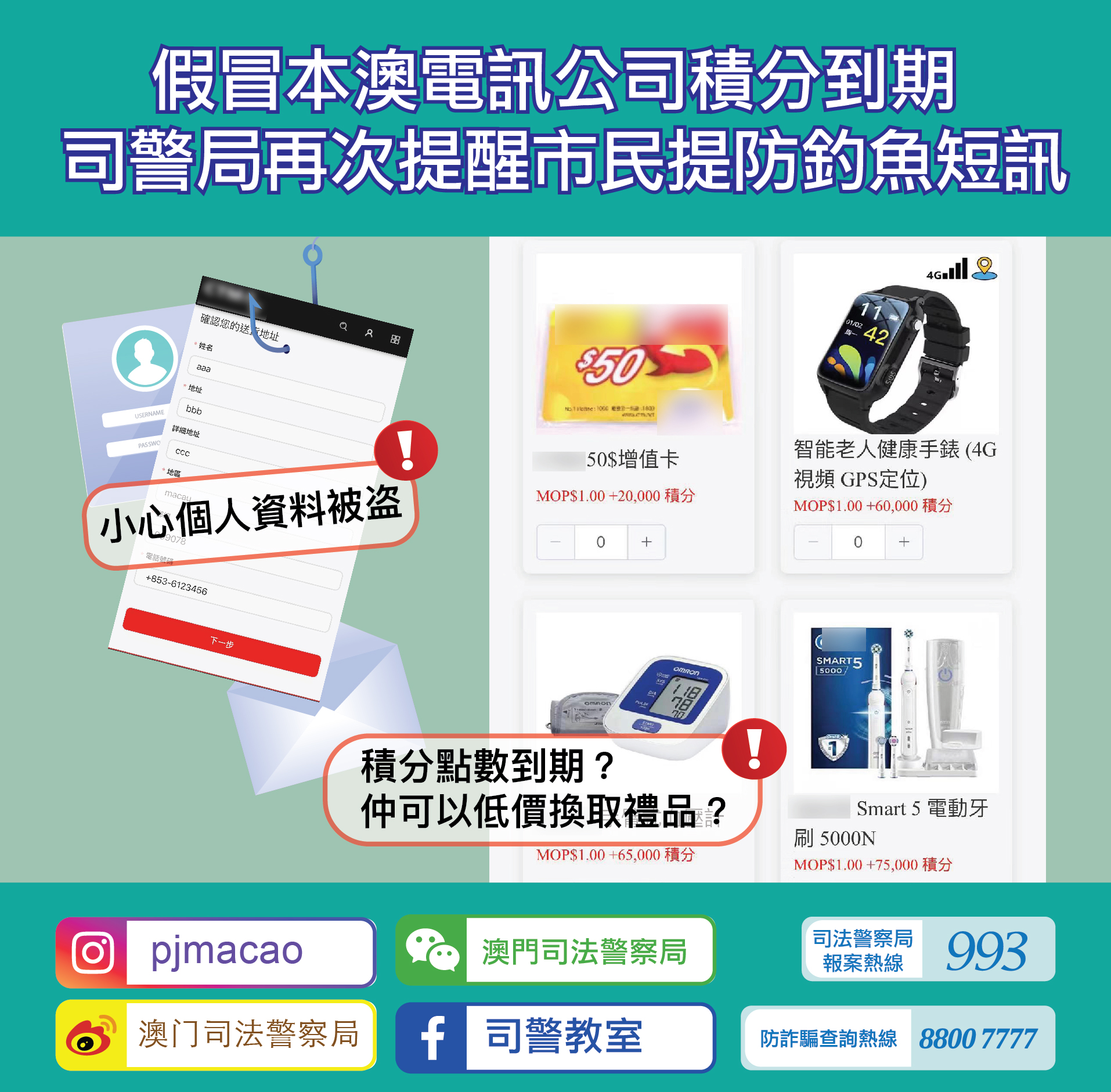 司法警察局近日再次發現假冒本澳某電訊公司的短訊,以積分點數到期須盡快換領獎賞為由,要求事主登入假冒網站,藉此套取個人資料及信用卡資料。