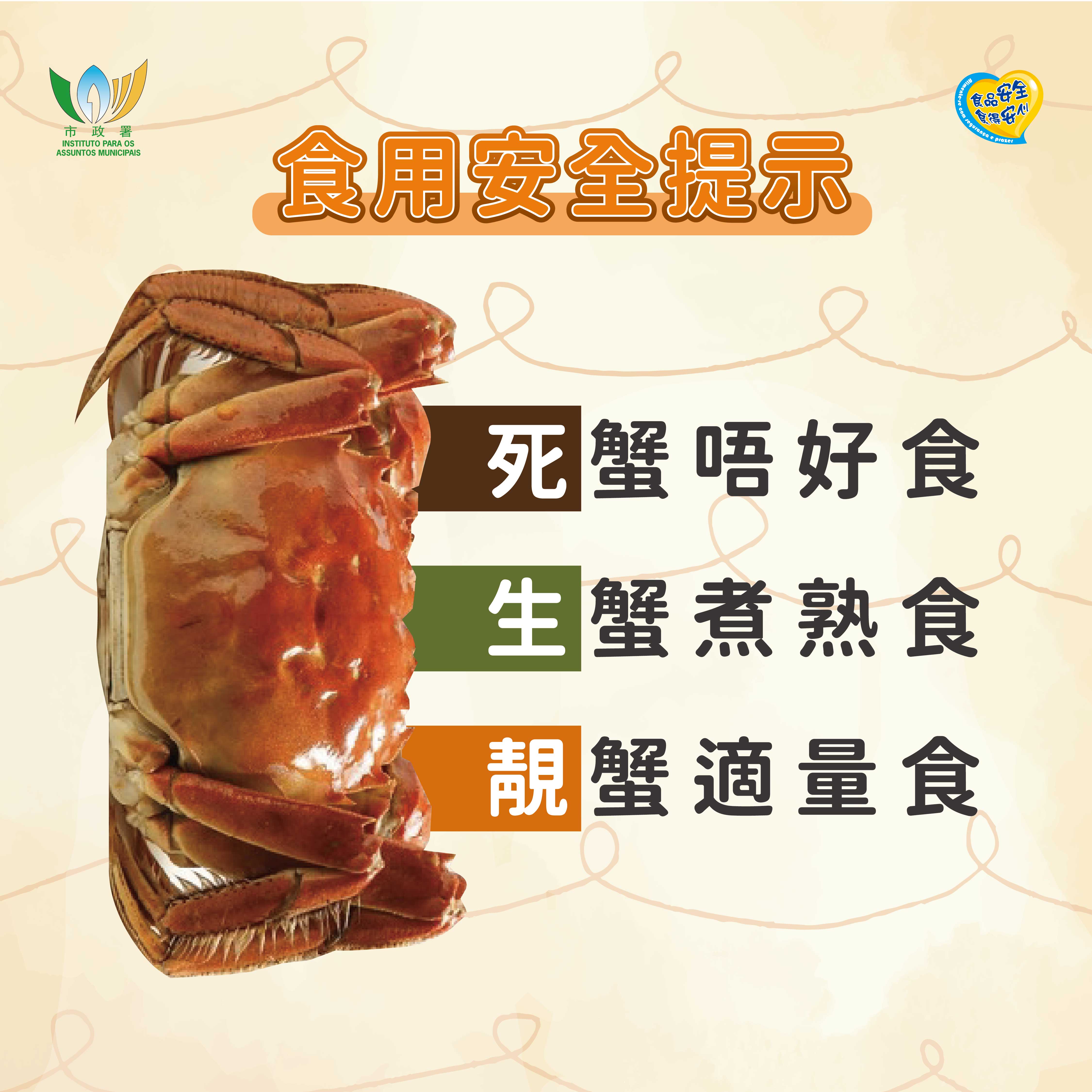 市政署提醒消費者,應向信譽良好及衛生可靠的店舖選購大閘蟹,並須清楚貨品來源。選購大閘蟹應以生猛、外殼完整有光澤、沒有異味為佳,進食前必須徹底煮熟。一旦蟹死亡,容易滋生大量微生物,不宜繼續烹煮食用。另外,市政署已開通“市政署食品安全資訊”微信訂閱號、Facebook專頁及Instagram帳號,並會因應季節性食安風險、社會關注的食安主題等,提供各類食安科普及風險提示資訊,歡迎市民關注。