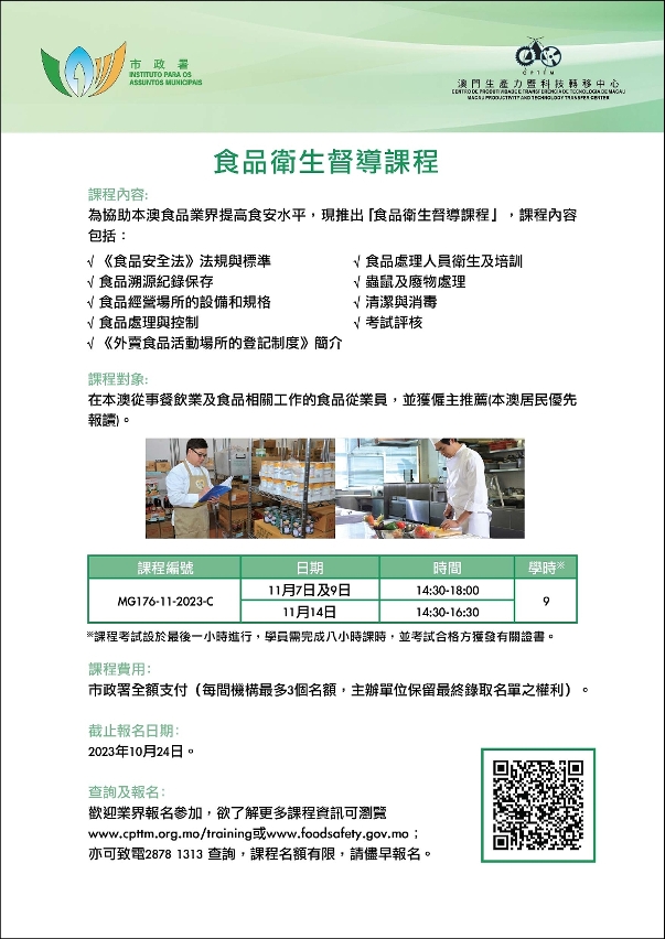 “食品衛生督導課程”則由市政署與澳門生產力暨科技轉移中心合辦,課程為期三天,分別於十一月七、九及十四日舉行,合共九小時,內容涵蓋《食品安全法》等法規與食安標準、食品溯源紀錄保存、經營場所的設備和規格、食品處理與衛生管理、蟲鼠防治及廢物處理、清潔與消毒等內容。報讀學員須由所屬食品公司或場所之僱主推薦報讀。學員在完成課程並通過考核後,可獲由市政署與澳門生產力暨科技轉移中心發出的證書。