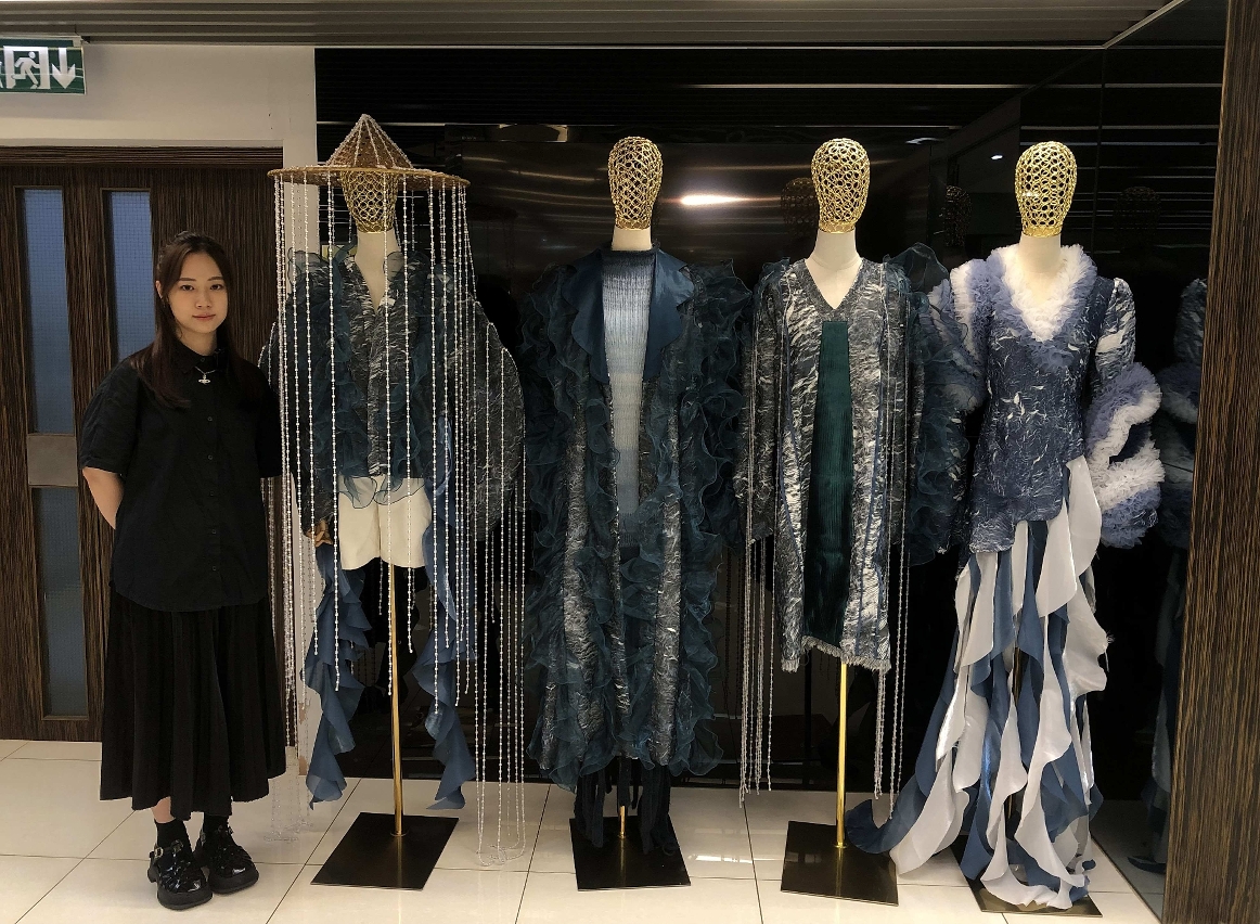 張悅鈴為生產力中心的時裝設計及製作文憑課程畢業生,在是次“漢帛獎”中,憑作品“泱泱”脫穎而出,躋身決賽。 “泱泱”為一系列四套女裝,以水的循環現象作為創作概念,稍後將於決賽場上展現風采。