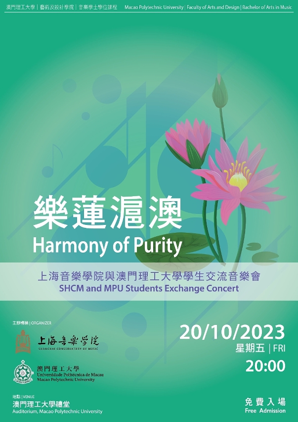 澳門理工大學與上海音樂學院將於2023年10月20日晚上8時於澳門理工大學禮堂舉辦“樂蓮滬澳——上海音樂學院與澳門理工大學學生交流音樂會”,為觀眾帶來一場中西音樂的饗宴。