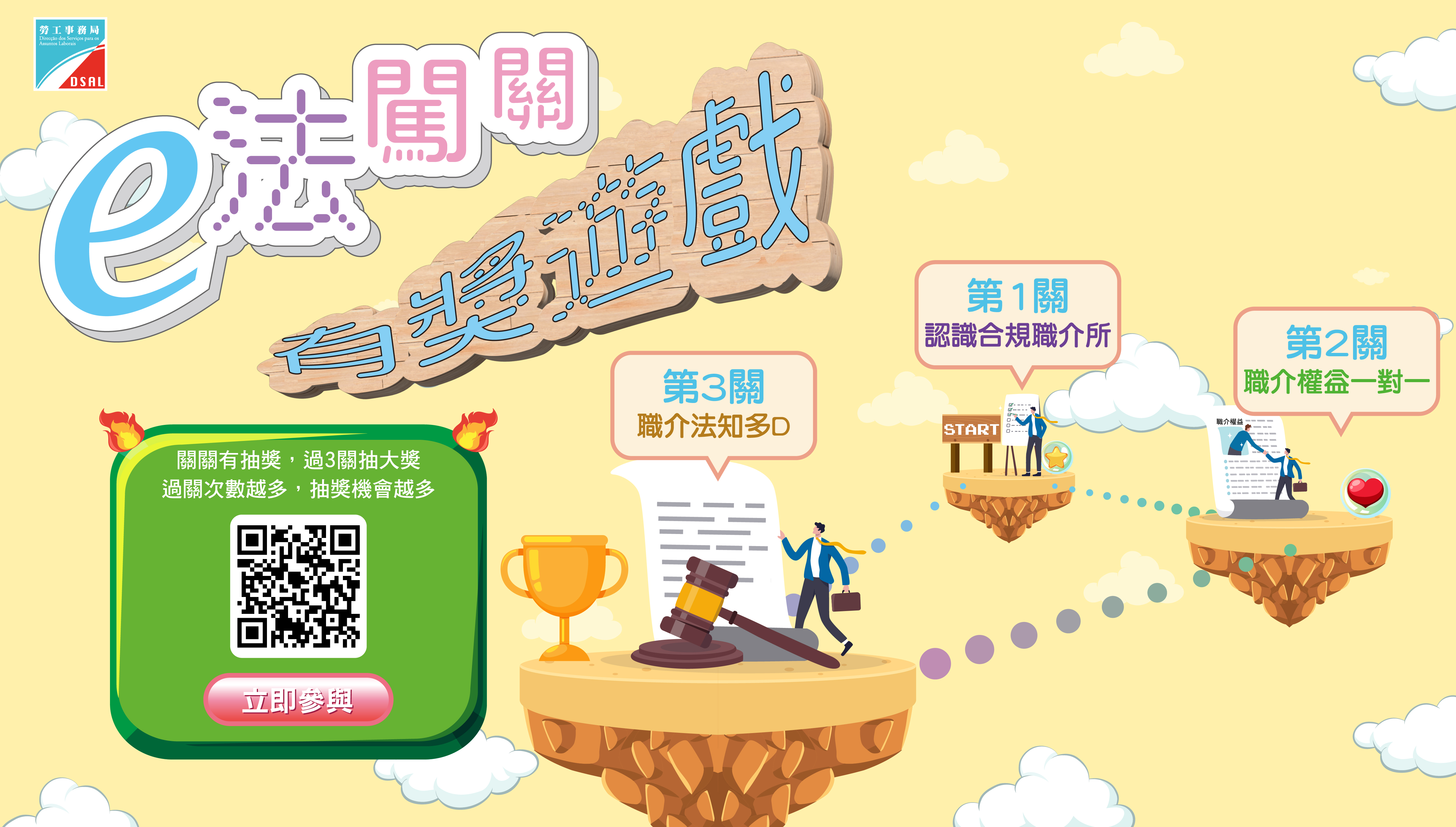 為鼓勵巿民參與網上學習課程,勞工局將於10月25日至11月23日期間,推出「e法闖關」有獎遊戲活動。公眾可於上述期間登入遊戲專頁(https://www3.dsal.gov.mo/levelgame/levelgame/index)回答問題,遊戲設有三關,每過一關均可獲得一次抽獎機會,每10天為一期進行合共三期抽獎。另外,凡成功過3關的參加者,更可自動參加“法寶箱大抽奬”,總獎金高達16,000澳門元。上述遊戲參加次數不限,越早參加,抽獎機會越多,歡迎公眾踴躍參與。