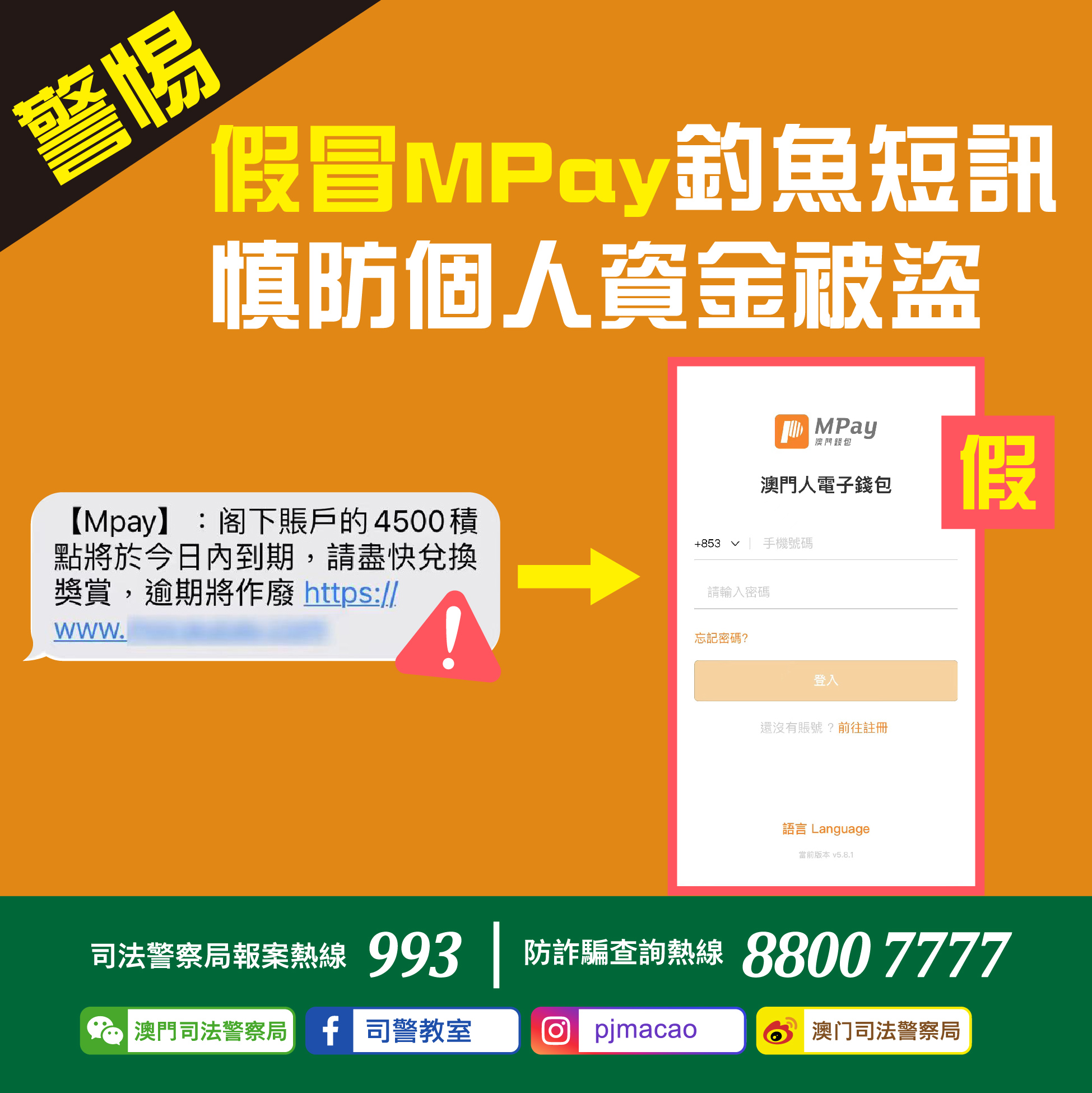 司法警察局今日接獲多名市民舉報,稱其手機收到假冒MPay的釣魚短訊,內容以積分點數到期須盡快換領獎賞為由,要求事主登入假冒網站並挑選欲以積分換領的獎品。過程中曾輸入MPay的帳號、登入密碼、一次性驗證碼及交易密碼等資訊。