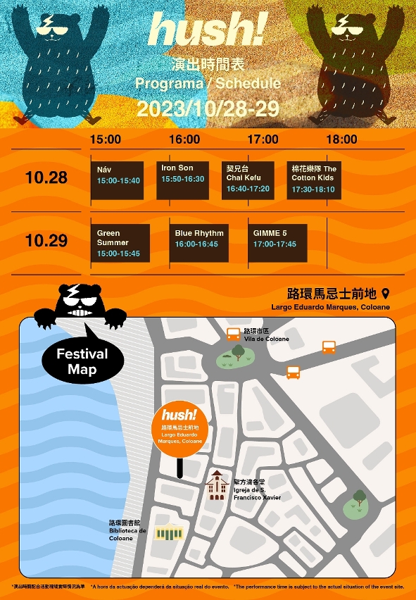 此外,hush! 音樂活動再次延伸至海上,一連兩周末特設“音樂海上遊”,將海陸結合的觀光概念提升至全新藝術層次,“澳門海上遊”觀光船將接載樂迷來往媽閣至路環,首周4場“音樂海上遊”將帶來活躍港澳的本地低音音樂場景重要人物之一DJ Saiyan,以及本地電音音樂製作人Lobo的演出,同時更將串聯馬忌士前地的hush! 音樂會,參與者只需徒步5分鐘即可前往馬忌士前地欣賞其他精彩演出。