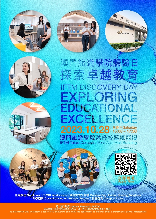 體驗日於10月28日下午三時至五時三十分在澳旅院氹仔校區東亞樓舉行,精彩活動包括酒店、文化旅遊及數碼營銷專題講座、傑出校友分享會、校園導賞、升學諮詢展位、工作坊等,呈現澳旅院豐富多元的課程設置及校園生活。體驗日亦設有澳葡土生美點自助下午茶,讓參與人士品嚐澳門特色美食。除此之外,同場可即場預約專業人像拍攝服務,率先體驗成為“成功澳旅院人",享受專業攝影帶來的獨特體驗。詳情及報名請瀏覽www.iftm.edu.mo/s/DiscoveryDay2023,查詢請致電8598 3023或8598 1558與澳旅院公關範疇聯繫。