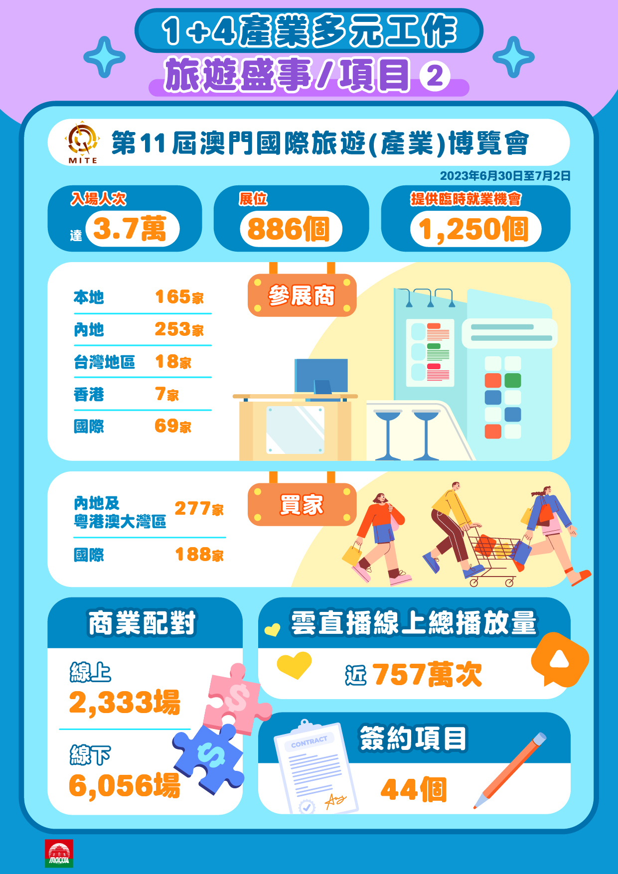 澳門國際旅遊(產業)博覽會(“旅博會”)助力旅遊及相關業界拓展商機,促進旅遊經濟。今年第11屆旅博會貫徹“1+4”適度多元發展策略,首設“1+4”展館,打造“旅遊+”合作新平台。今屆匯聚世界各地業者現場交流洽商,展位、參展商及特邀買家數目為歷屆最多。三天展會共吸引達3.7萬人次觀眾入場,雲直播線上總播放量近757萬次,線上線下商業配對合計超過8,300場,期間促成了44個簽約項目。