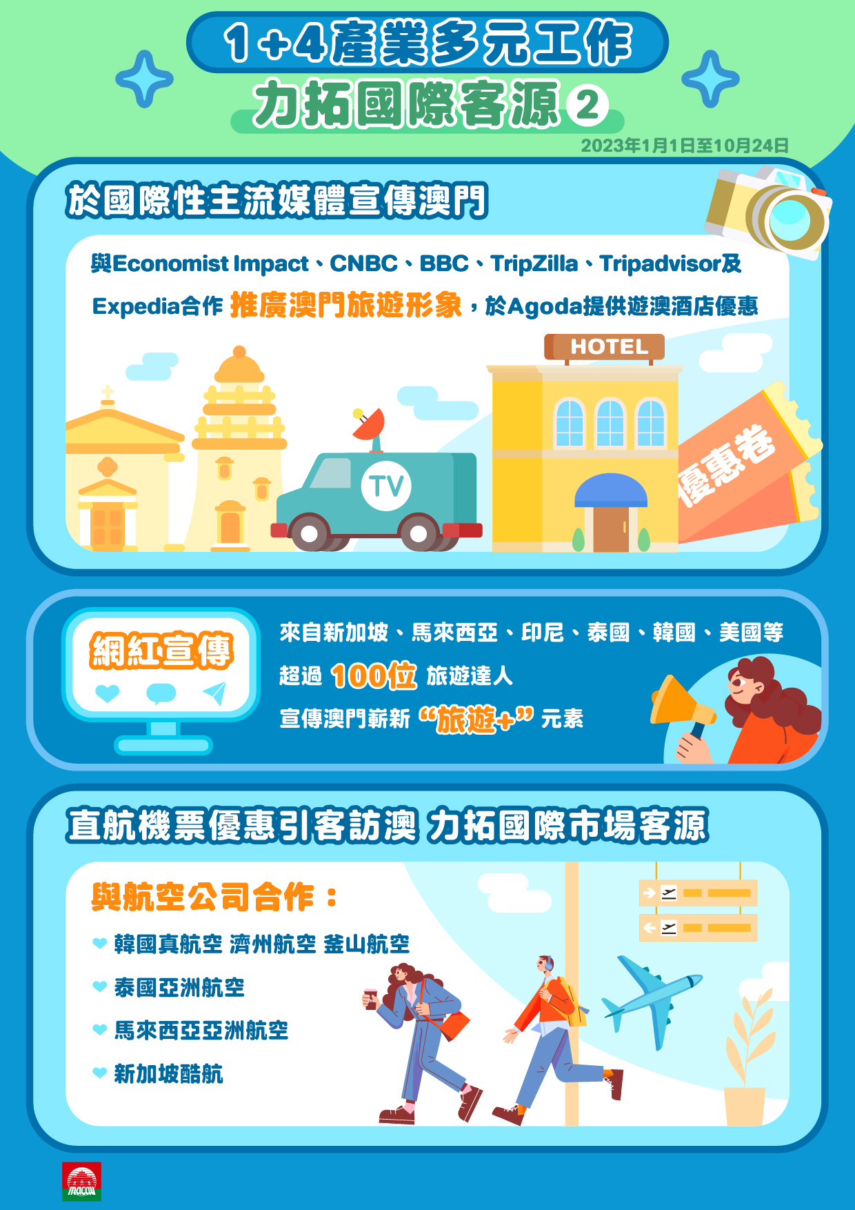 此外,與具廣泛傳播及影響力之國際性主流媒體及大型電商平台、來澳出席活動的名人明星及社交達人KOL合作推廣澳門旅遊形象,開拓不同客源。截至今年10月,已邀請來自新加坡、馬來西亞、印尼、泰國、韓國及美國等國際市場超過100位旅遊達人來澳宣傳澳門嶄新“旅遊+”元素。