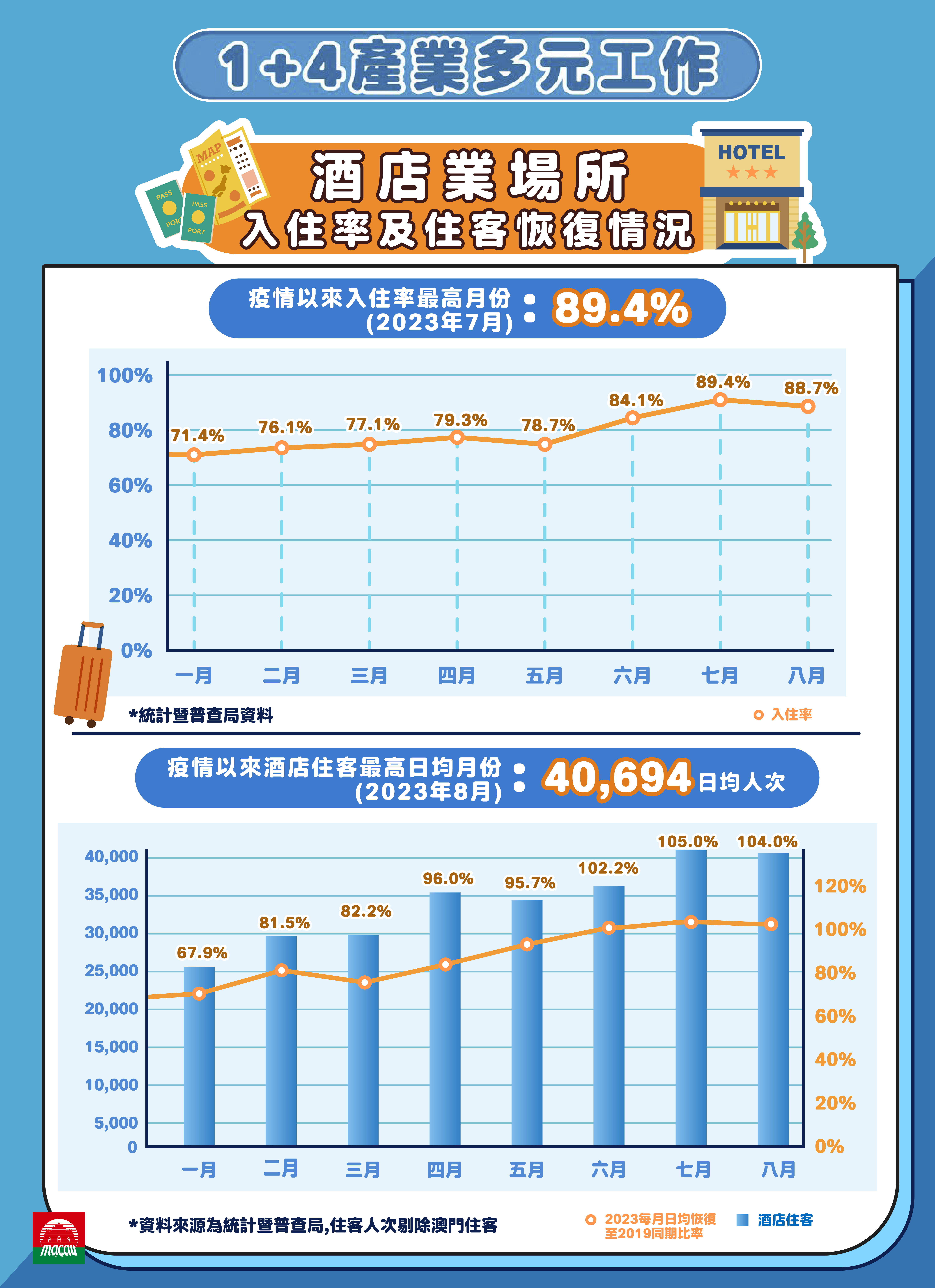 旅遊局透過“旅遊+”跨界融合發展,加強旅遊業與文創、體育、會展、美食及大健康等關聯產業的互動發展和深度融合,配合特區政府的“1+4”適度多元發展策略。同時,新娛樂場幸運博彩經營批給合同已於今年1月1日生效,承批公司按照合同要求,有序落實各項投資計劃、協助開拓外國客源市場及發展,當中包括會議展覽、娛樂表演、體育盛事、文化藝術、健康養生、主題遊樂、美食之都、社區旅遊及海上旅遊等非博彩元素。