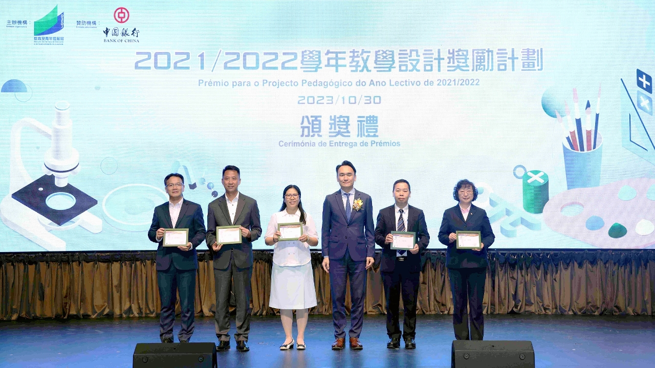 “2021/2022學年教學設計獎勵計劃”頒獎禮於10月30日假聖保祿學校禮堂舉行。教育及青年發展局局長龔志明,中央人民政府駐澳門特別行政區聯絡辦公室教育與青年工作部副部長石書正,中國銀行(澳門)股份有限公司副總裁陳榮達,教青局副局長丁少雄、阮佩賢及黃嘉祺,評審機構代表及顧問,上訴委員會、教育委員會及教學人員專業委員會委員,各高等教育院校及非高等教育學校代表等出席活動。