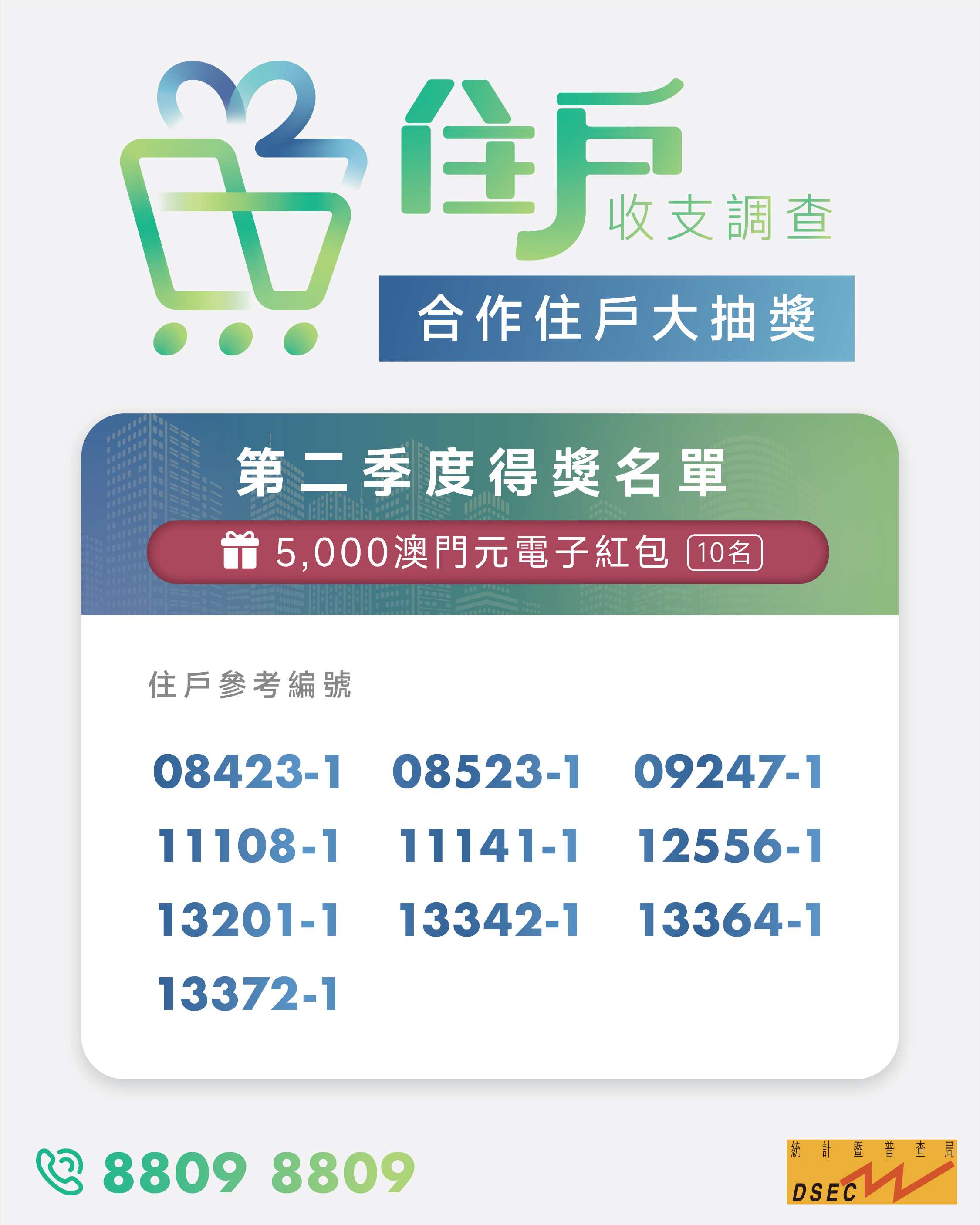 第二季度“合作住戶大抽獎”的抽獎儀式已於10月27日舉行,共抽出10個得獎住戶,住戶參考編號如下:08423-1、08523-1、09247-1、11108-1、11141-1、12556-1、13201-1、13342-1、13364-1及13372-1。統計局將以信函方式通知得獎住戶。